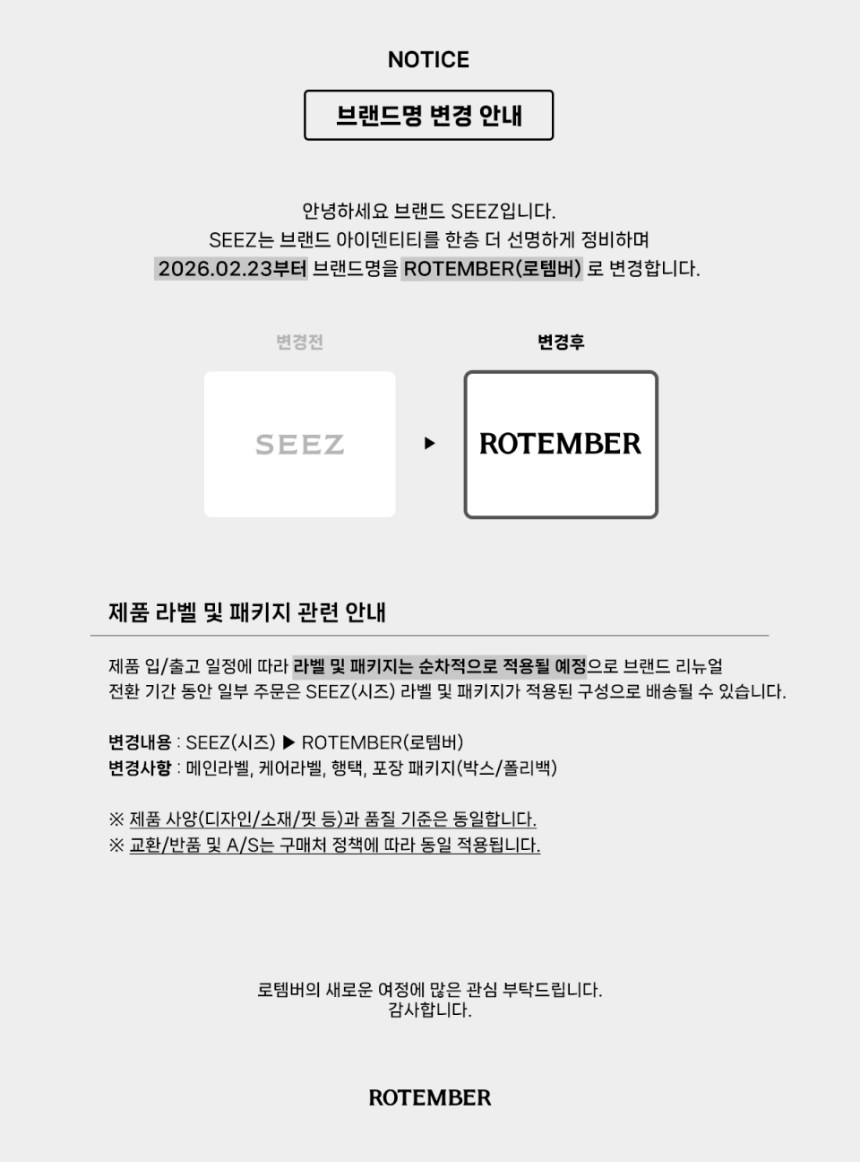 로템버(ROTEMBER)는 미니멀리즘을 기반으로 실루엣과 소재에 집중하며 불필요한 메시지를 덜어내고 절제된 디테일과 선의 흐름으로 일상에 자연스럽게 정리되는 균형과 선명한 존재감을 제안하는 브랜드입니다.