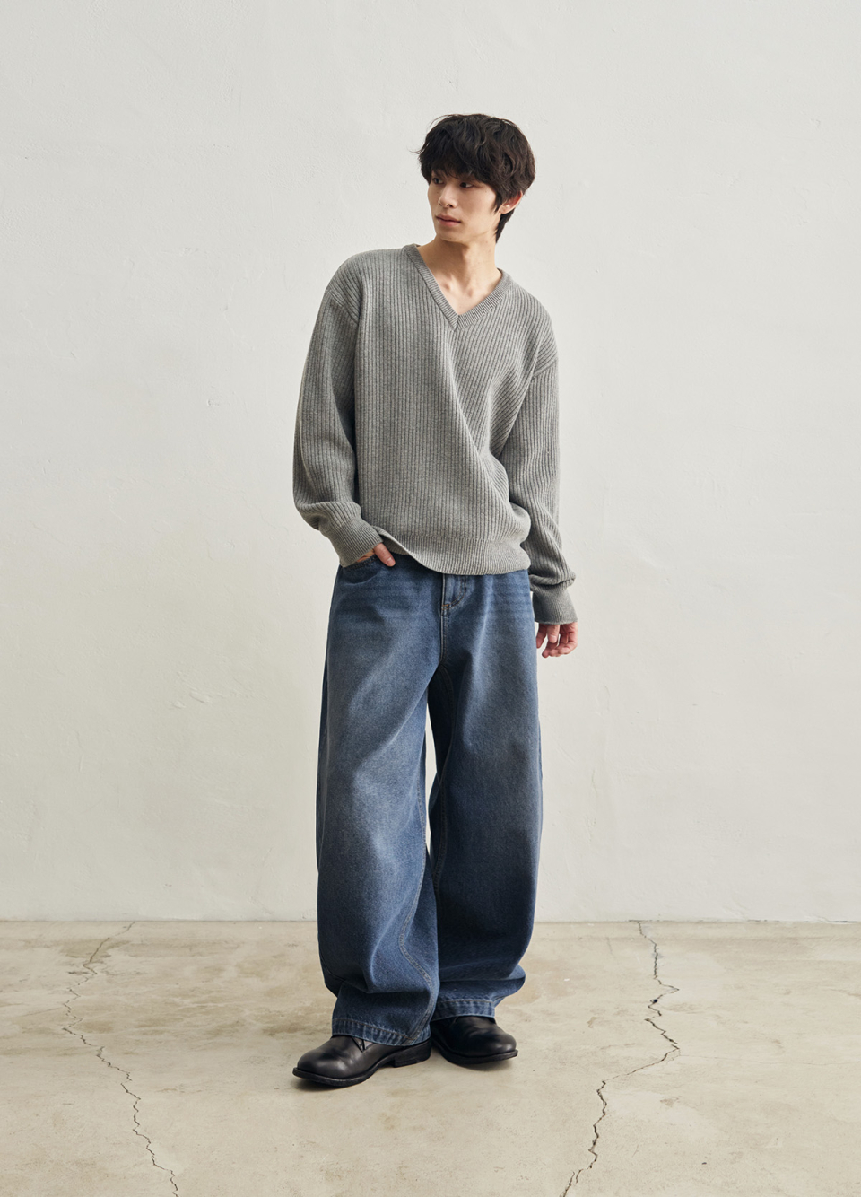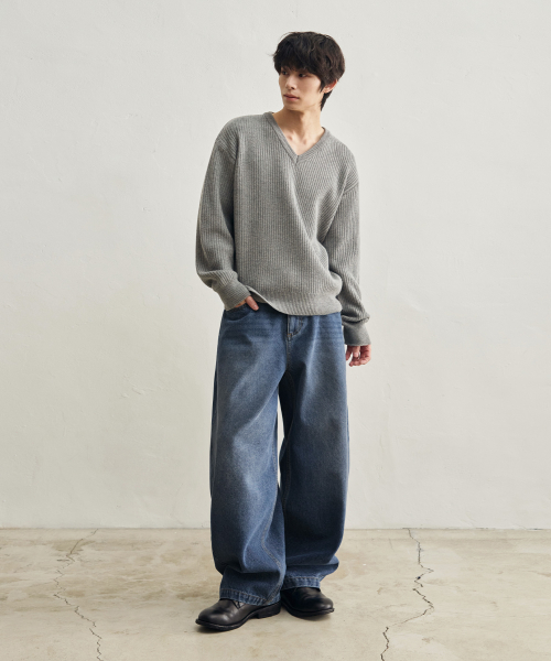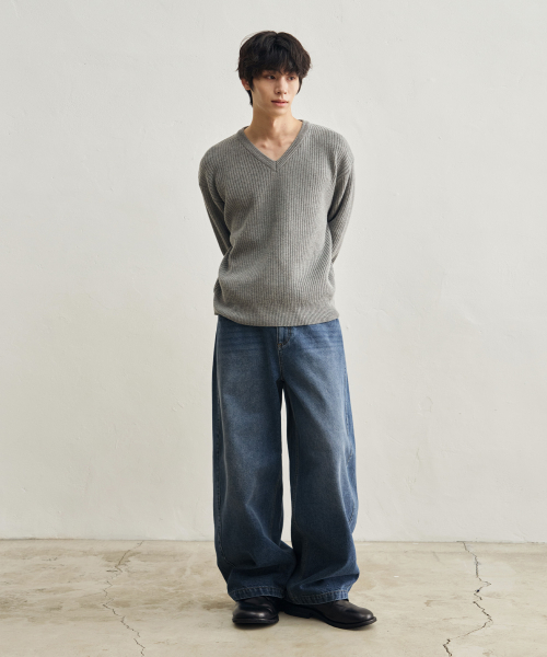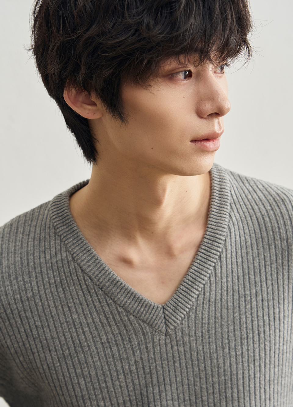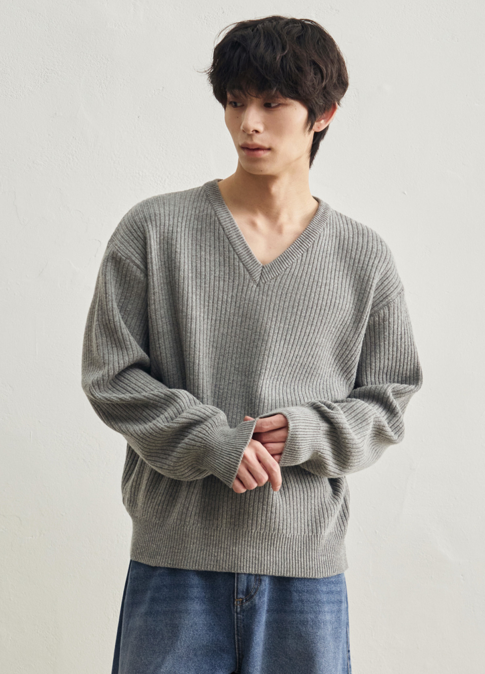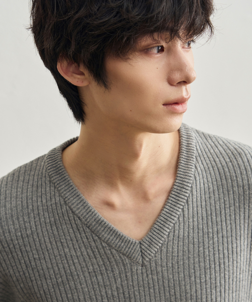 리브드 브이넥 크롭 니트 [멜란지 그레이]