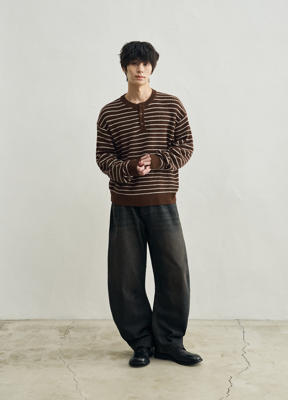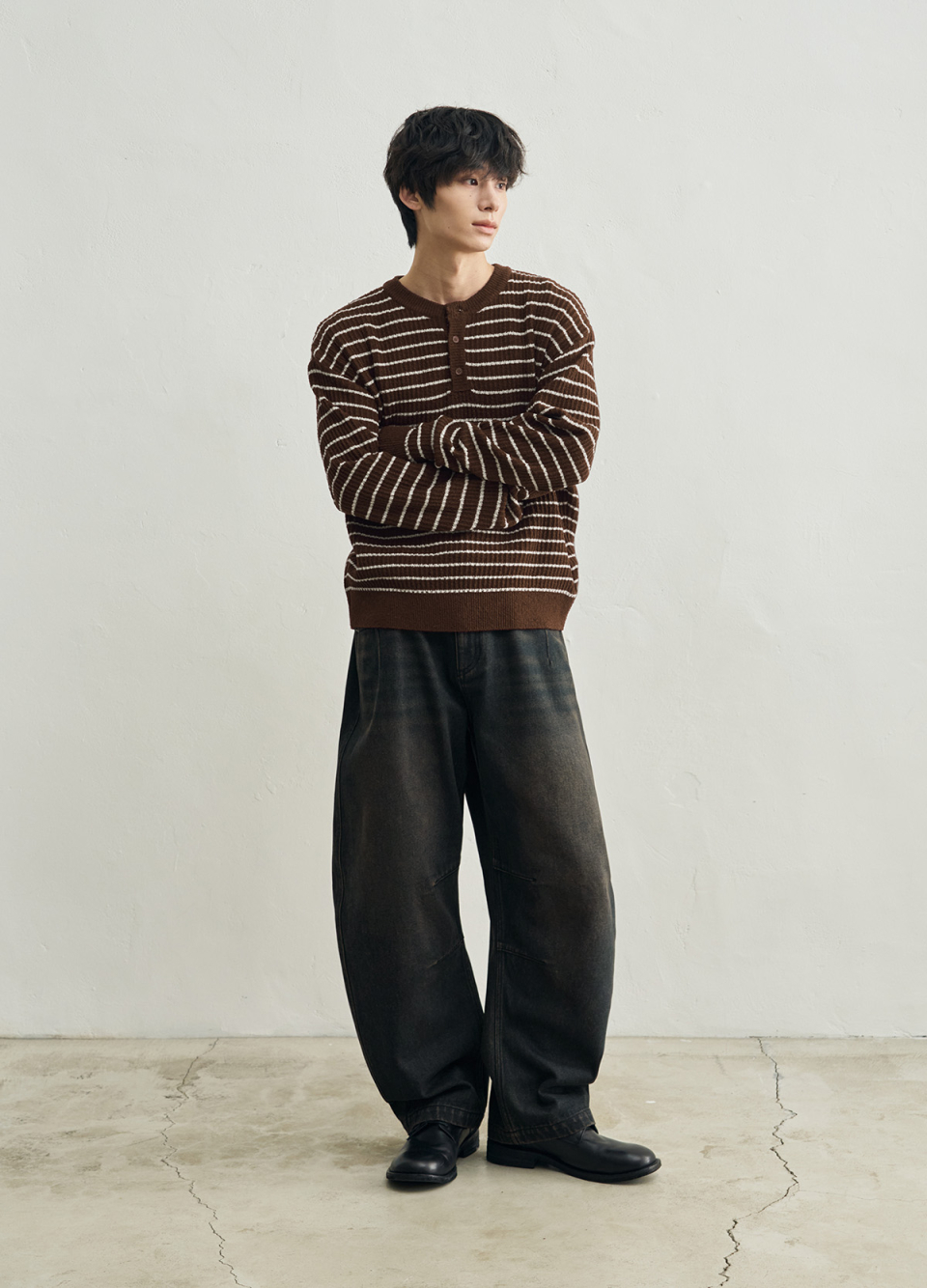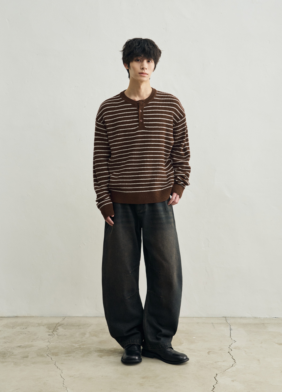 로우 스트라이프 헨리넥 크롭 니트 [브라운]