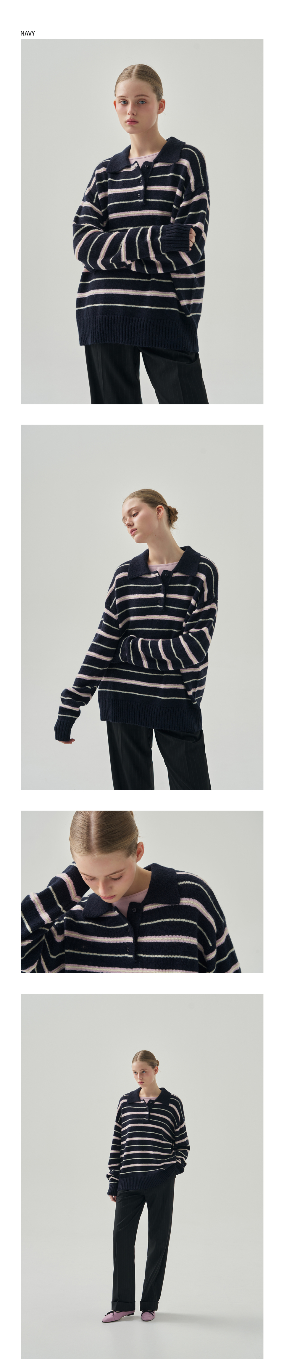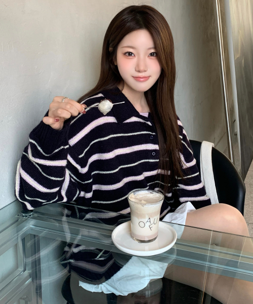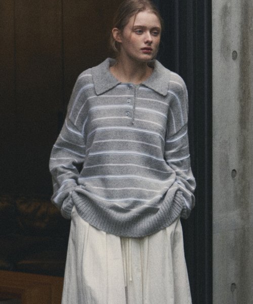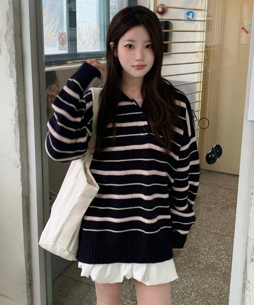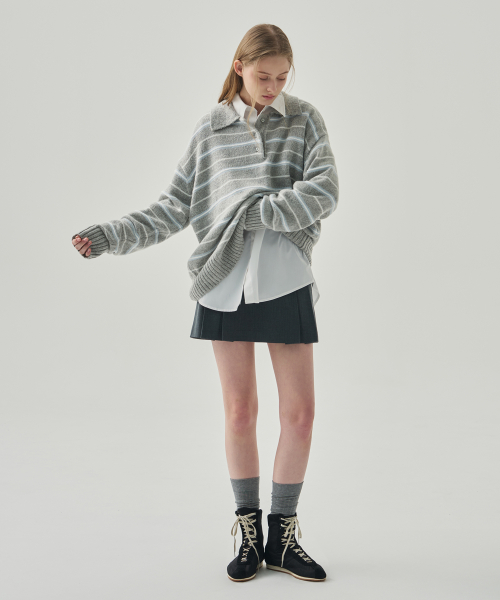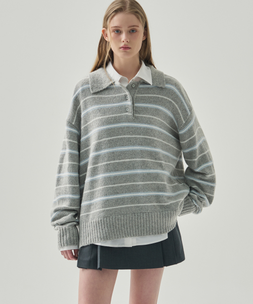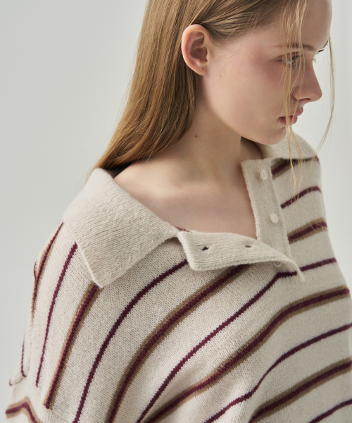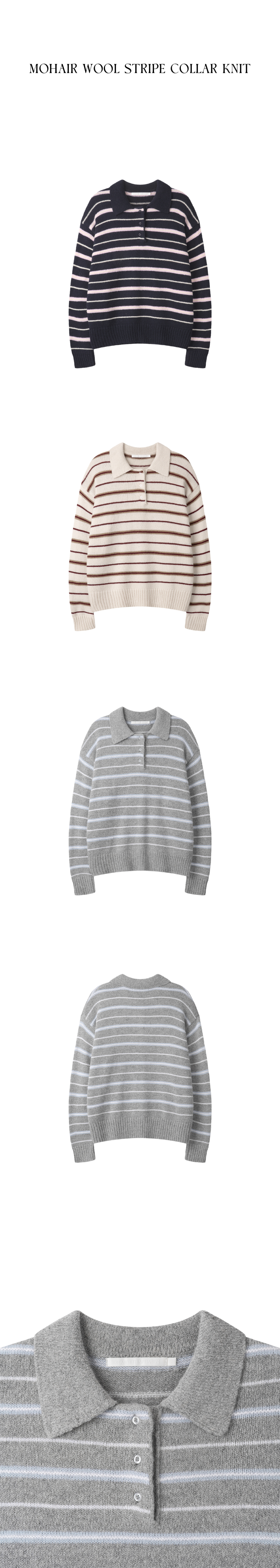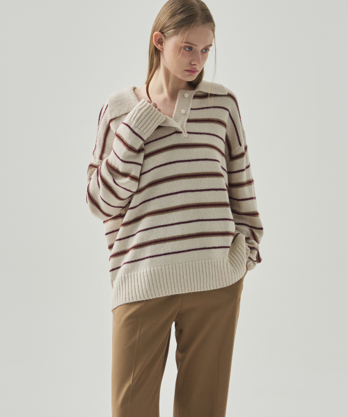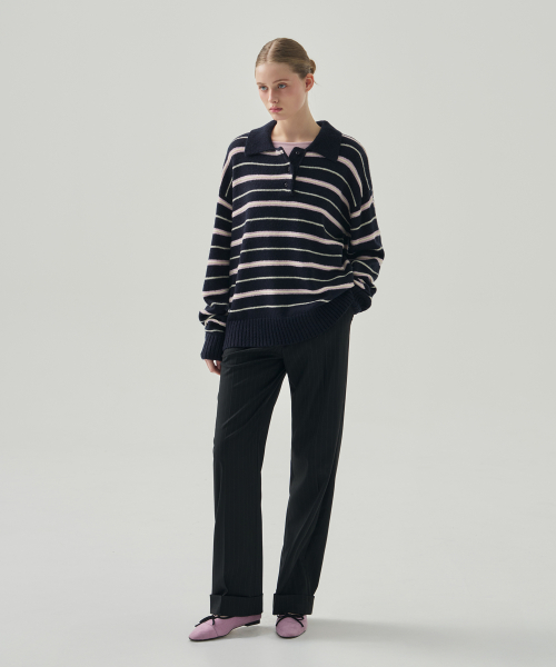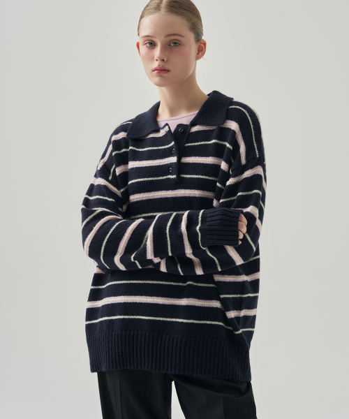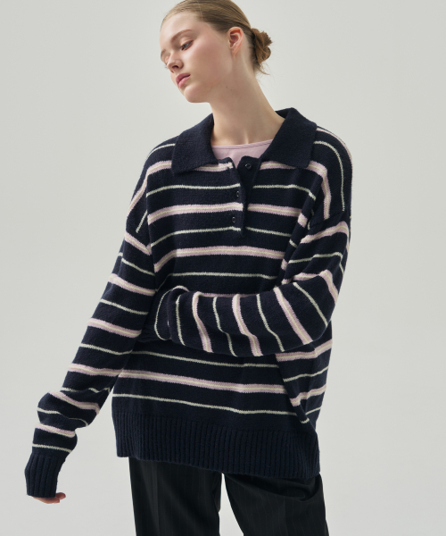 모헤어 울 스트라이프 카라 니트 [NAVY]