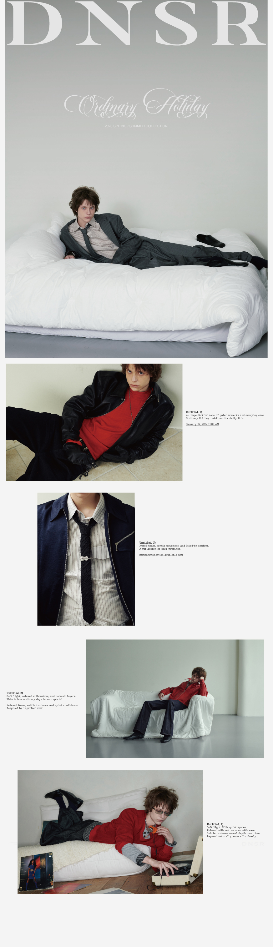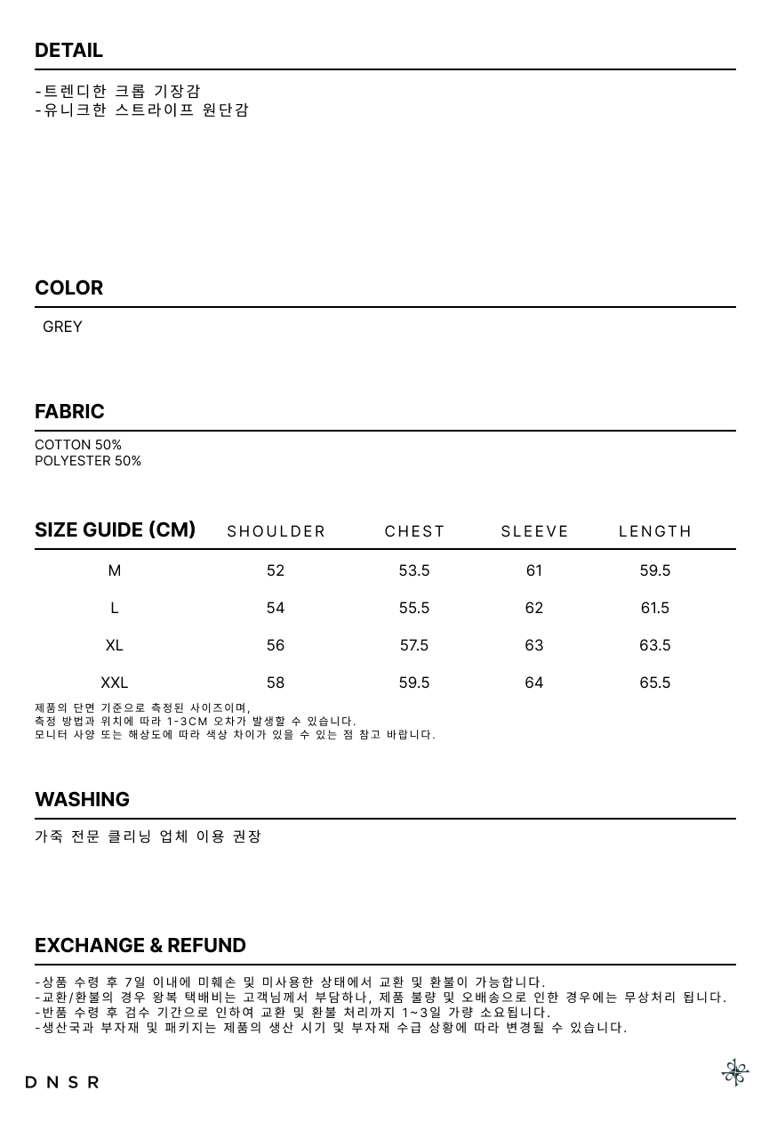 디앤에스알(DNSR)는 'Do New things, Something to realize'라는 슬로건을 바탕으로, 동시대에 흐름에 발 맞춰 항상 독창적이고 새로운 시도를 하고 있습니다. 디앤에스알의 DNA는 현대 복식을 기반으로 하는 오리지널리티의 견고한 테일러링을 고수하며 시대의 흐름을 읽고 변화하는 무드와 스타일링을 제안하는 스트릿 캐주얼 웨어입니다.