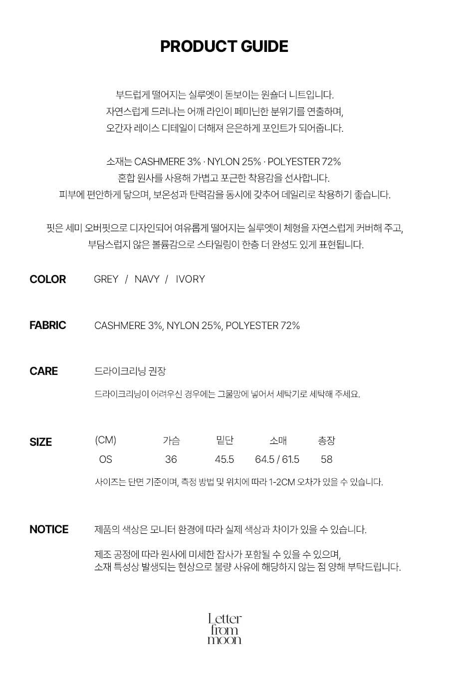 레터프롬문(LETTER FROM MOON)은 이름에 어울리는 로맨틱&레트로 무드의 옷을 만드는 브랜드입니다. 여성 고객을 타깃으로 아이템마다 레터프롬문의 개성이 들어가게끔 정성을 다해 디자인합니다. 특히 디자이너 브랜드의 의류는 가성비가 좋지 않다는 편견을 깨기 위해 합리적인 가격의 차별화된 아이템을 자신 있게 선보입니다.