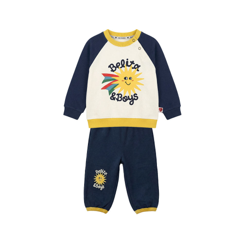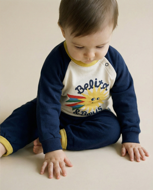 크림 컬러 바탕에 네이비와 옐로우 배색이 돋보이는 베이비 상·하의 세트 아이템입니다. 전면에는 벨리타앤보이즈 시즌 그래픽인 햇님 그래픽을 더해 발랄하면서도 유니크한 무드를 담았습니다. 팬츠에도 동일한 그래픽 포인트를 더해 세트로 착용 시 더욱 완성도 있는 스타일링이 가능하며 키즈 아이템과 함께 형제룩, 남매룩으로 연출하기 좋습니다.