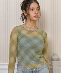 체크 시스루 롱 슬리브-올리브
