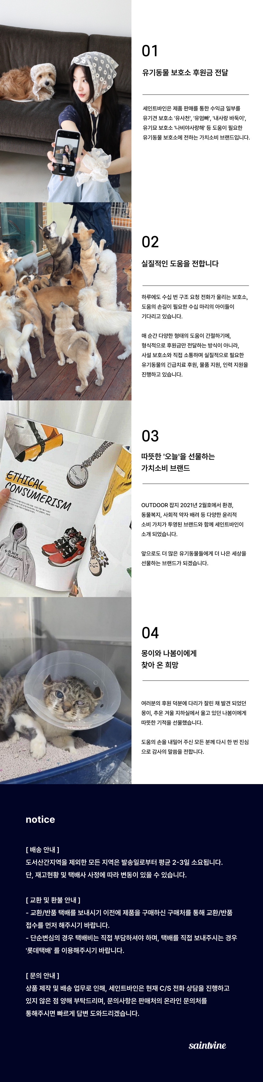 세인트바인(SAINTVINE)은 유기동물에게 따뜻한 오늘을 선물하기 위해 만들어진 가치소비 브랜드입니다. 한 해 발생하는 유기동물은 약 12만 마리이며, 이 중 주인을 찾아 따뜻한 집으로 돌아가거나 새로운 주인을 만나는 경우는 절반도 채 되지 못합니다. 주인을 찾지 못한 유기동물의 대부분은 보호소 안에서 영문도 모른 채 죽음을 맞이하게 됩니다. 세인트바인은 이러한 유기동물의 더 나은 미래를 위해 앞장서고자 합니다.