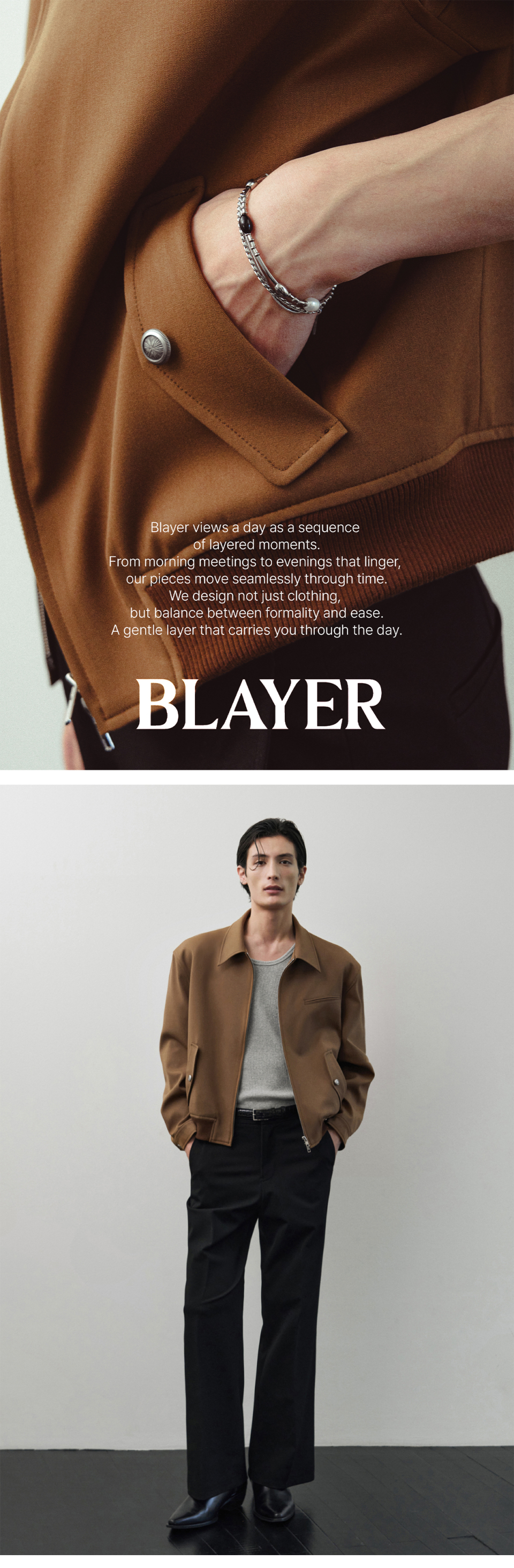 블레이어(BLAYER)는 단정함 속의 여유와 실용성에 담긴 감성, 절제된 디테일 속 특별함을 바탕으로 하루의 모든 순간을 하나의 선처럼 자연스럽게 연결하는 ‘하루의 레이어’를 제안하는 브랜드입니다.