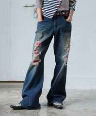 DESTROYED CHECK BOOT-CUT DENIM PANTS / dark blue