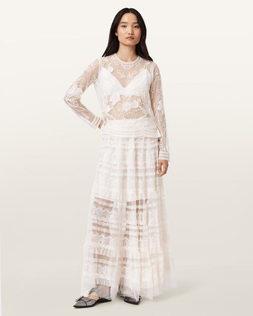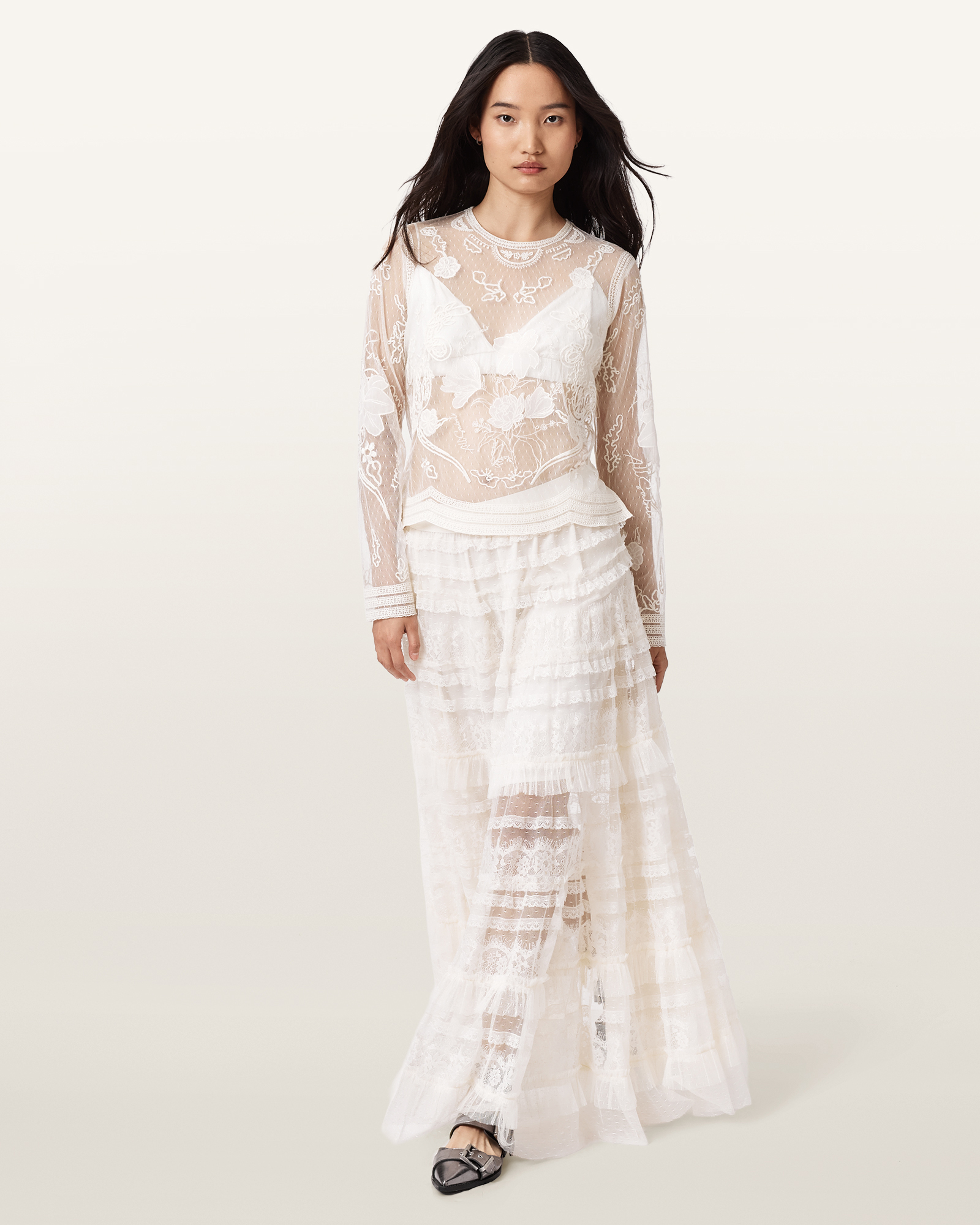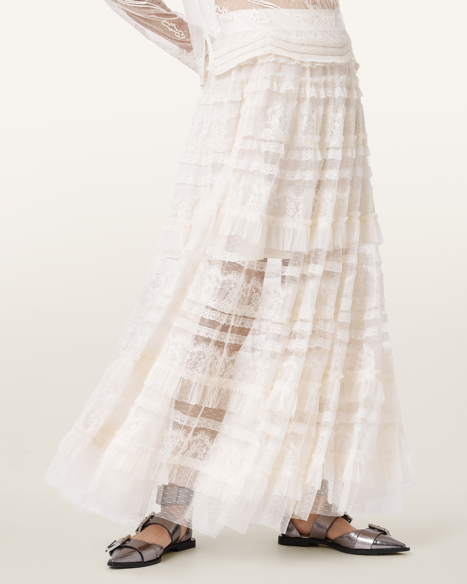 알리아 튤 스커트는 시어한 레이스와 튤 레이어가 어우러져 움직임마다 드라마틱한 실루엣을 완성하는 아이템입니다. 가볍게 퍼지는 맥시 기장과 섬세한 패널 디테일이 조화를 이루며 단독으로도 충분한 존재감을 드러냅니다. 매칭 톱과 함께 스타일링하면 한층 더 완성도 높은 룩을 연출할 수 있습니다.