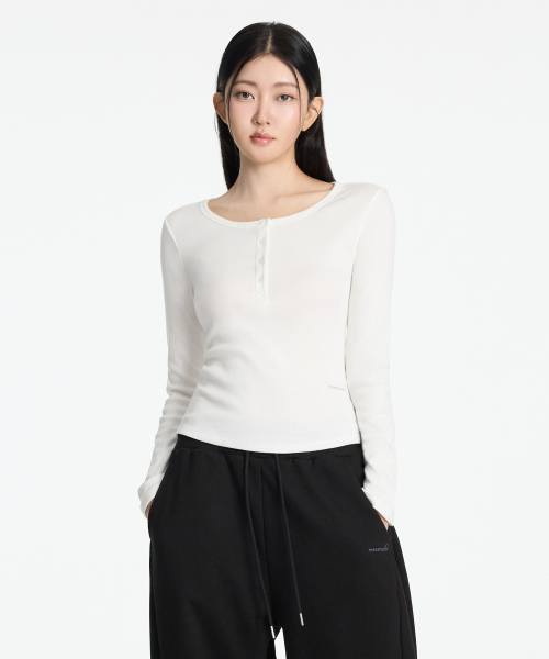 우먼즈 리브드 슬림 와이드 헨리 넥 긴소매 티셔츠 [화이트]