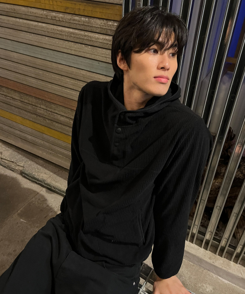 리브드 스냅 헨리넥 크롭 티셔츠 [블랙]