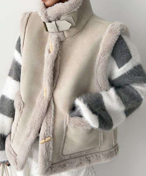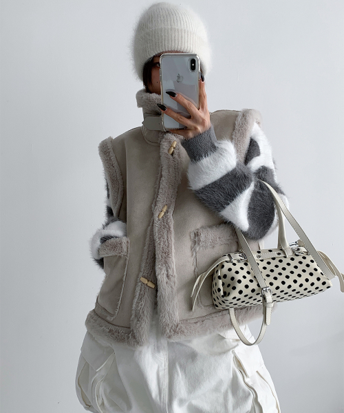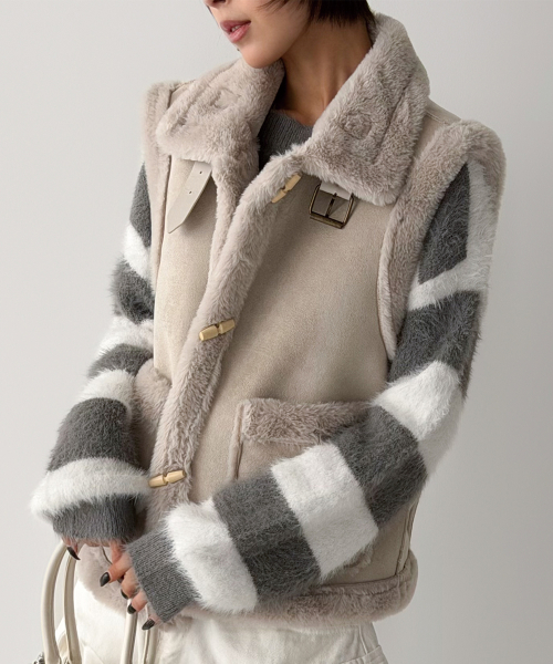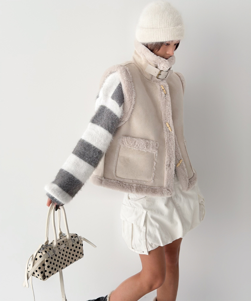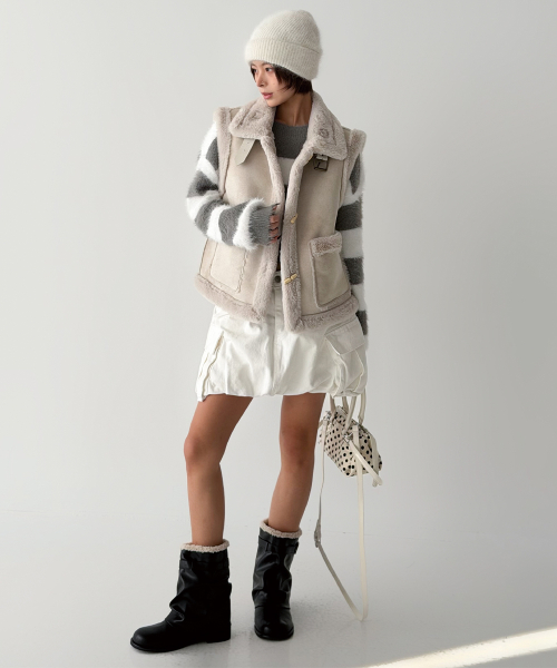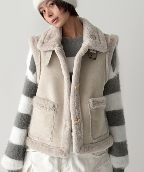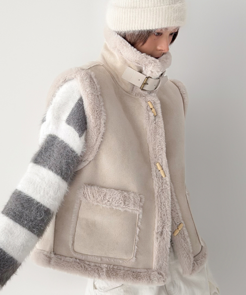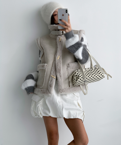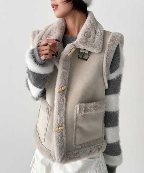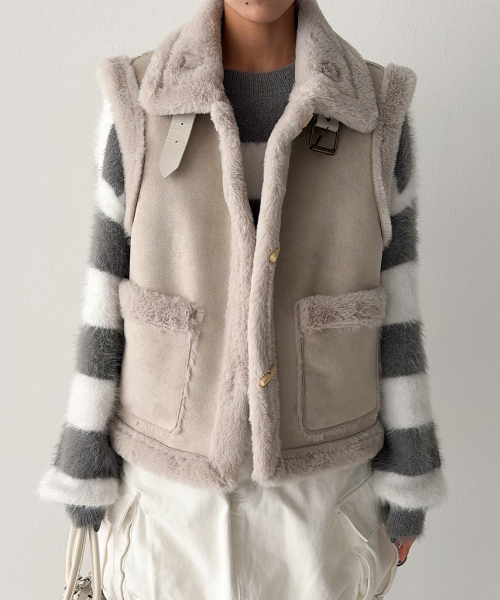 스웨이드 터치의 매트한 겉감과 퍼 트리밍 안감으로, 걸치는 순간 룩에 작은 설렘이 생기는 무스탕 베스트입니다.