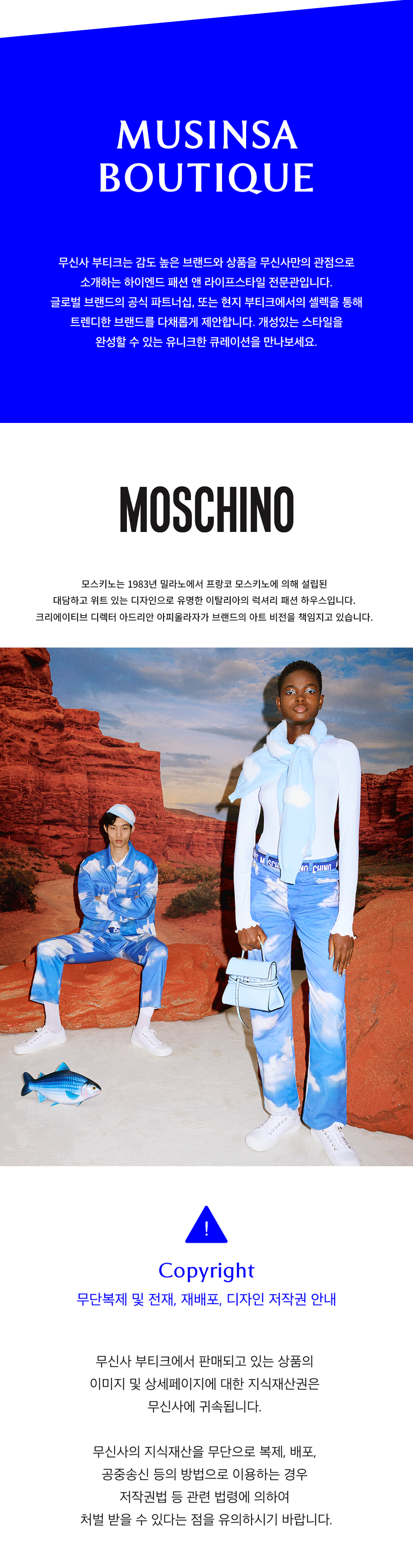 모스키노(MOSCHINO)는 1983년 밀라노에서 프랑코 모스키노에 의해 설립되었으며, 대담하고 위트 있는 디자인으로 유명한 이탈리아의 럭셔리 패션하우스입니다. 모스키노는 Alberta Ferretti, Philosophy di Lorenzo Srafini, Pollini가 포함된 Aeffe Group 산하에서 여성복 레디 투 웨어, 남성복, 액세서리 컬렉션을 선보입니다.