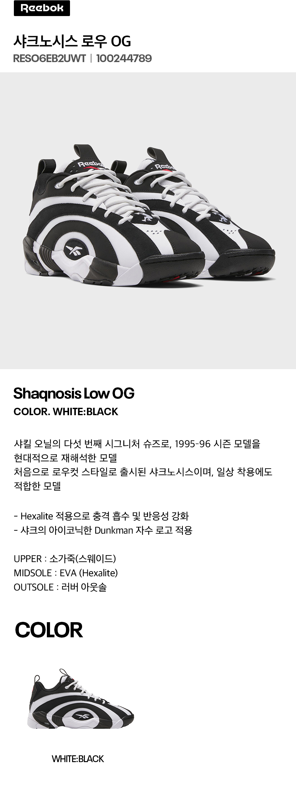 리복(REEBOK)은 1895년 세계 최초의 스파이크 러닝화 개발을 시작으로 뛰어난 기술력과 트렌디한 디자인을 집약한 혁신적인 아이템을 선보이는 브랜드입니다. 클럽 C 85, 클래식 레더 등 리복 고유의 클래식 무드를 보여주는 스니커즈 라인은 컬처와 트렌드를 대변하는 아이콘이 되었고, 펌프, 헥사라이트, DMX 등 끊임없이 발전해 온 테크놀로지는 전 세계 스포츠인에게 꾸준히 사랑받고 있습니다. 또한, 활발하게 전개하는 컬래버레이션 라인과 혁신적인 시도를 통해 100여 년이 넘게 지난 지금도 무한한 가능성을 보여주고 있습니다.
