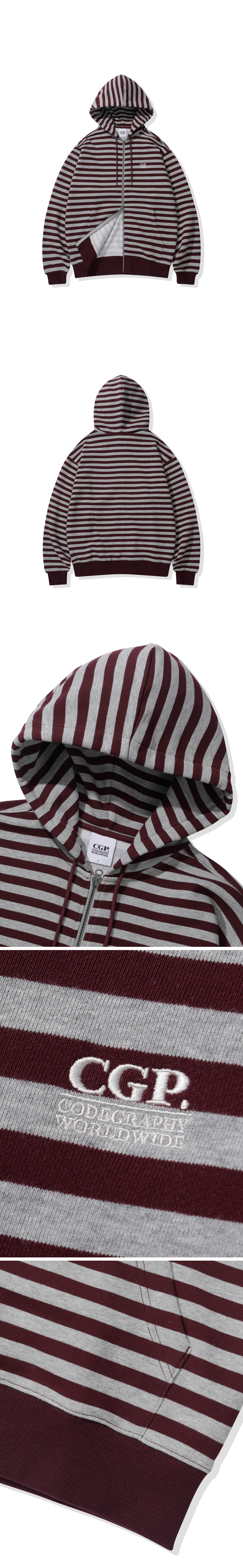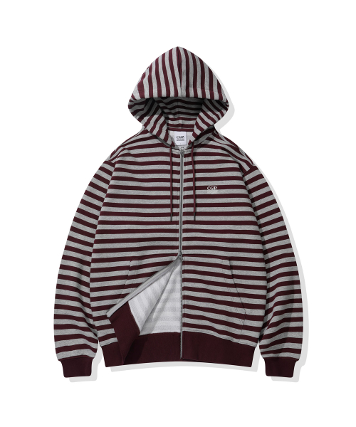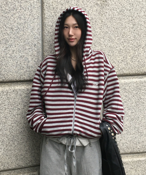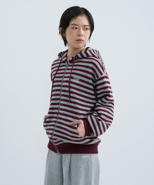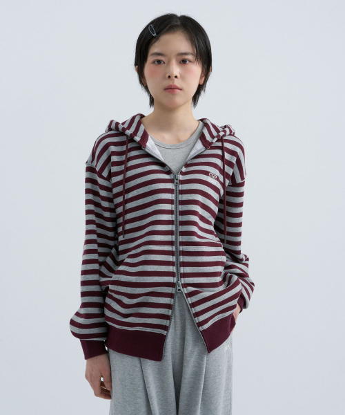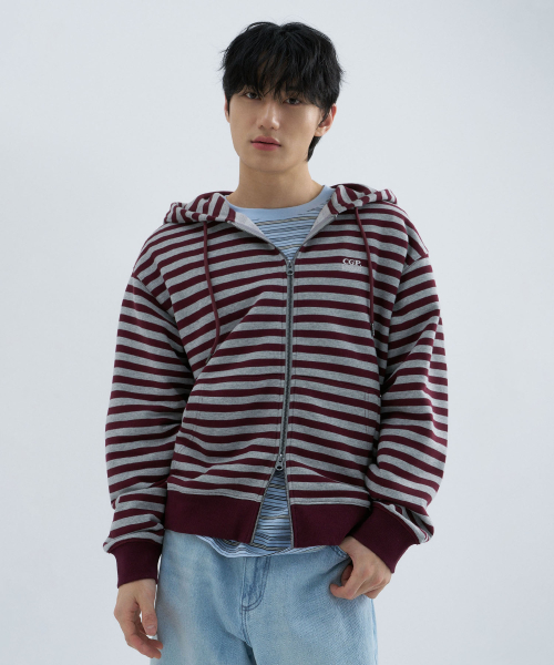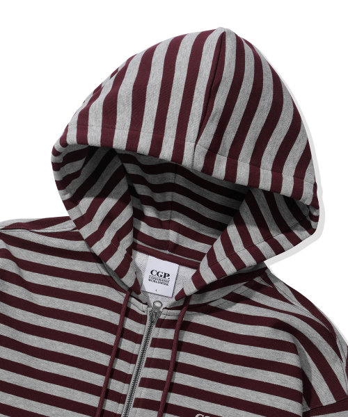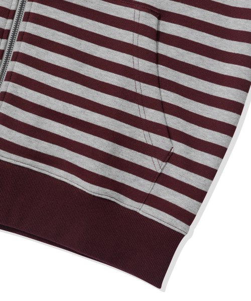 스트라이프 후드 집업-버건디