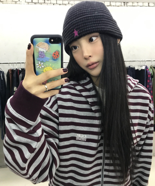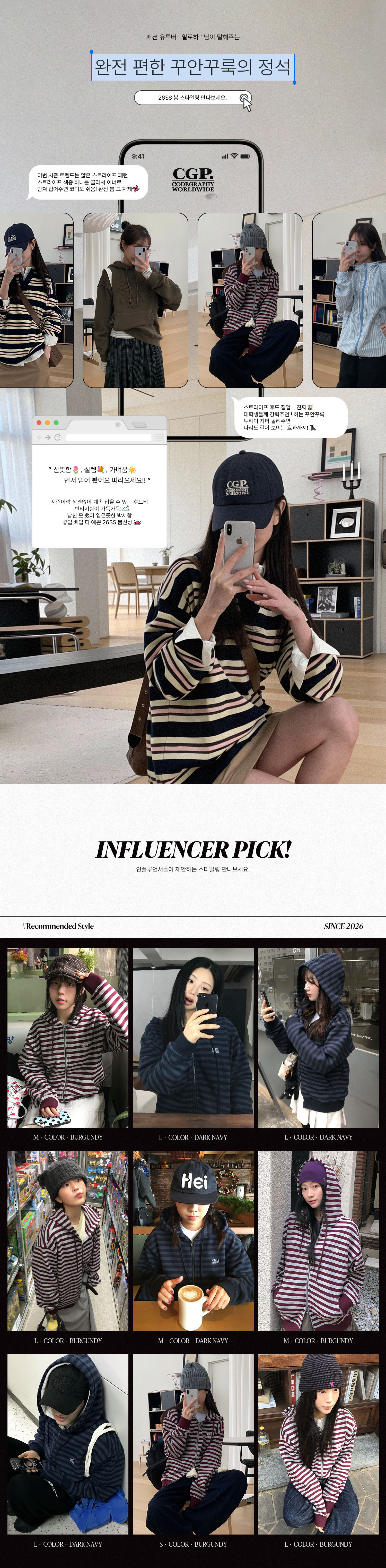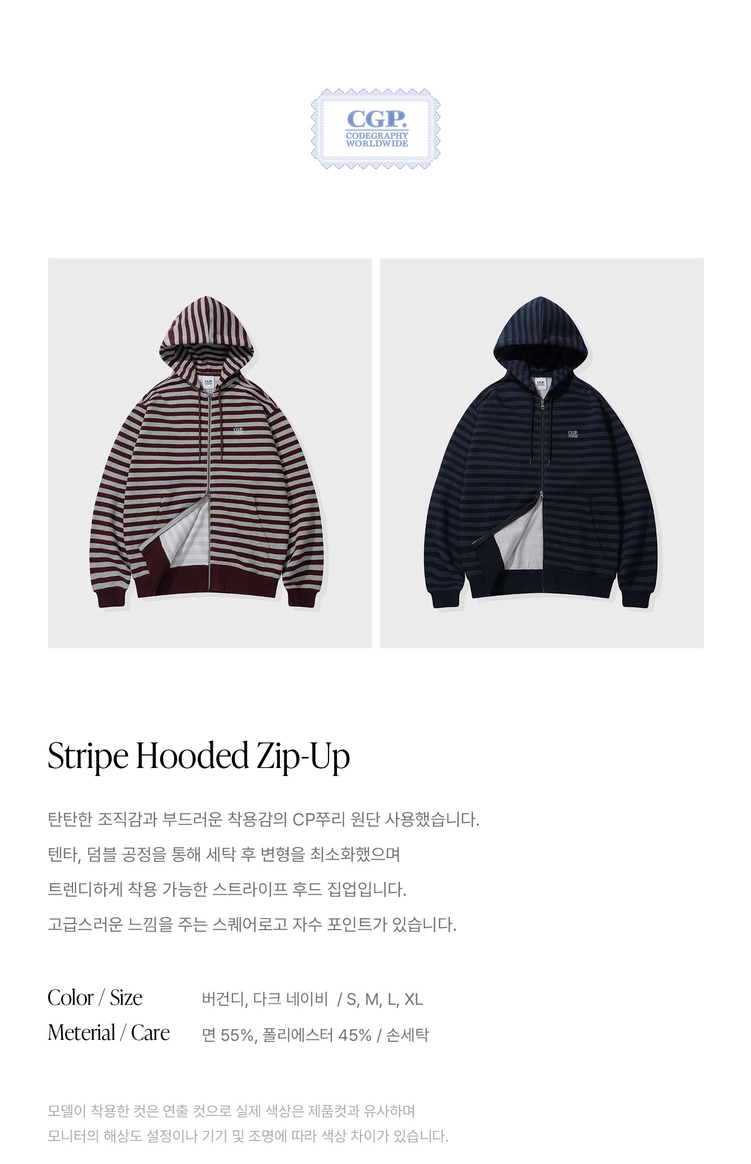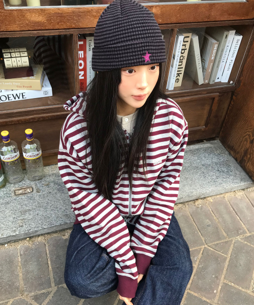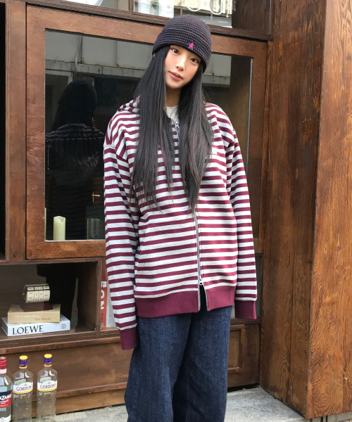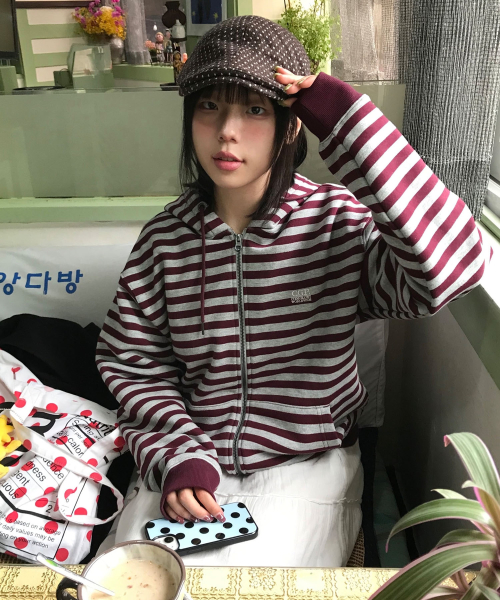 스트라이프 후드 집업-버건디