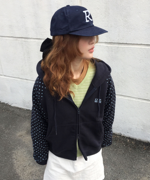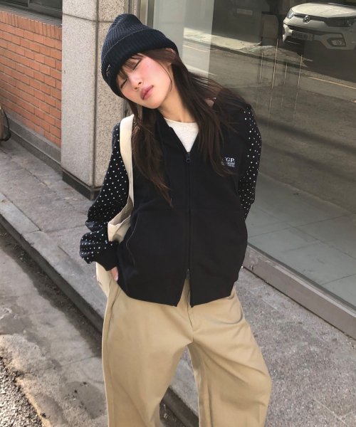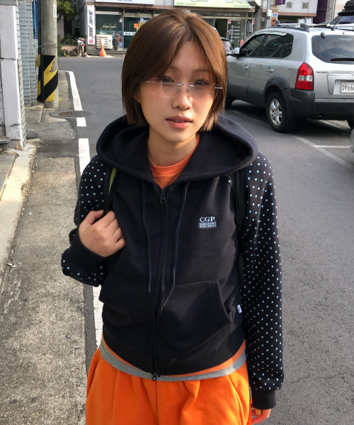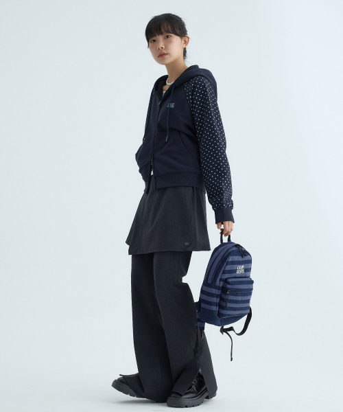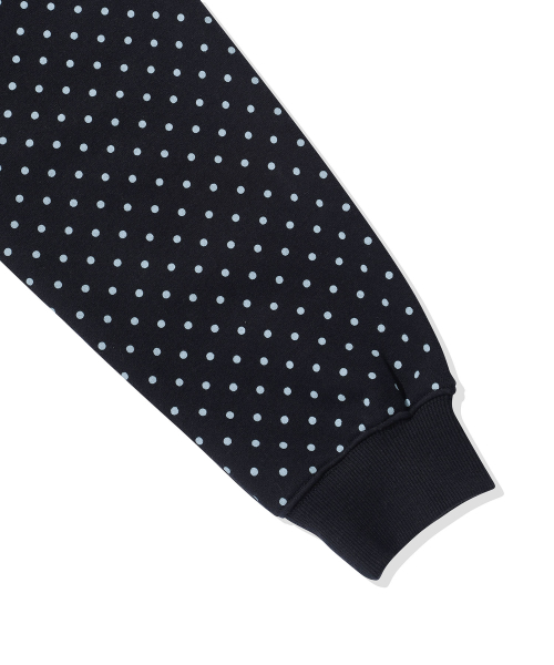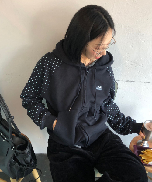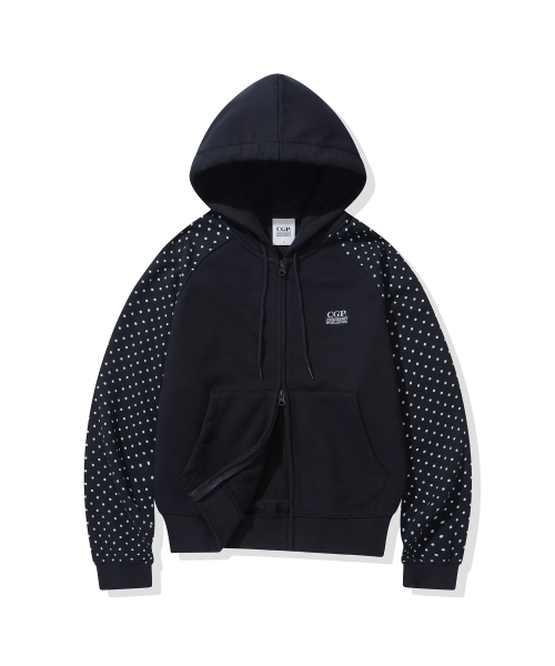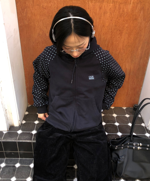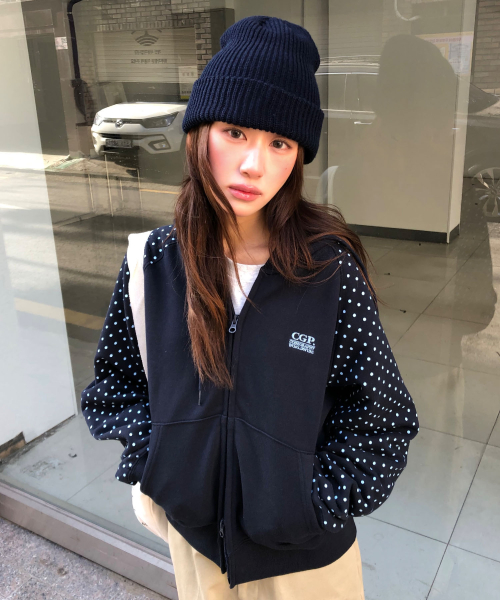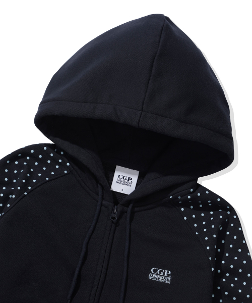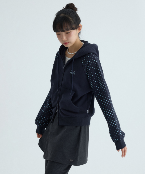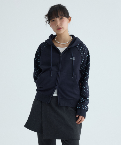 (우먼) 레글런 배색 도트 후드 집업-다크 네이비