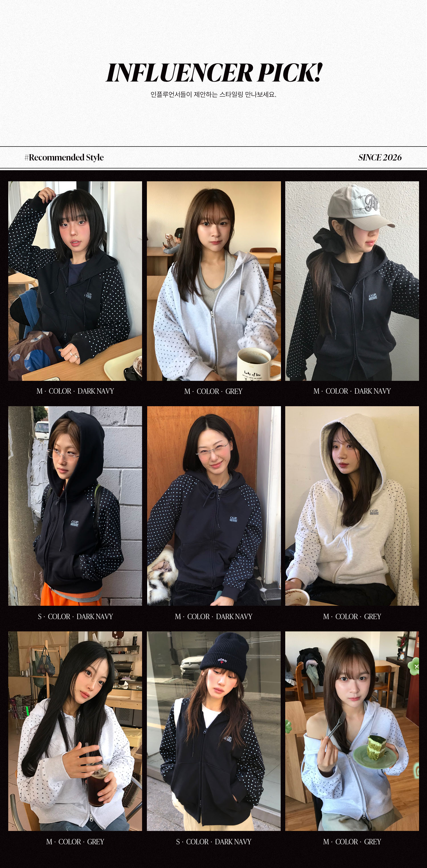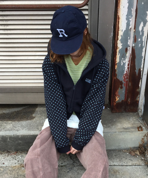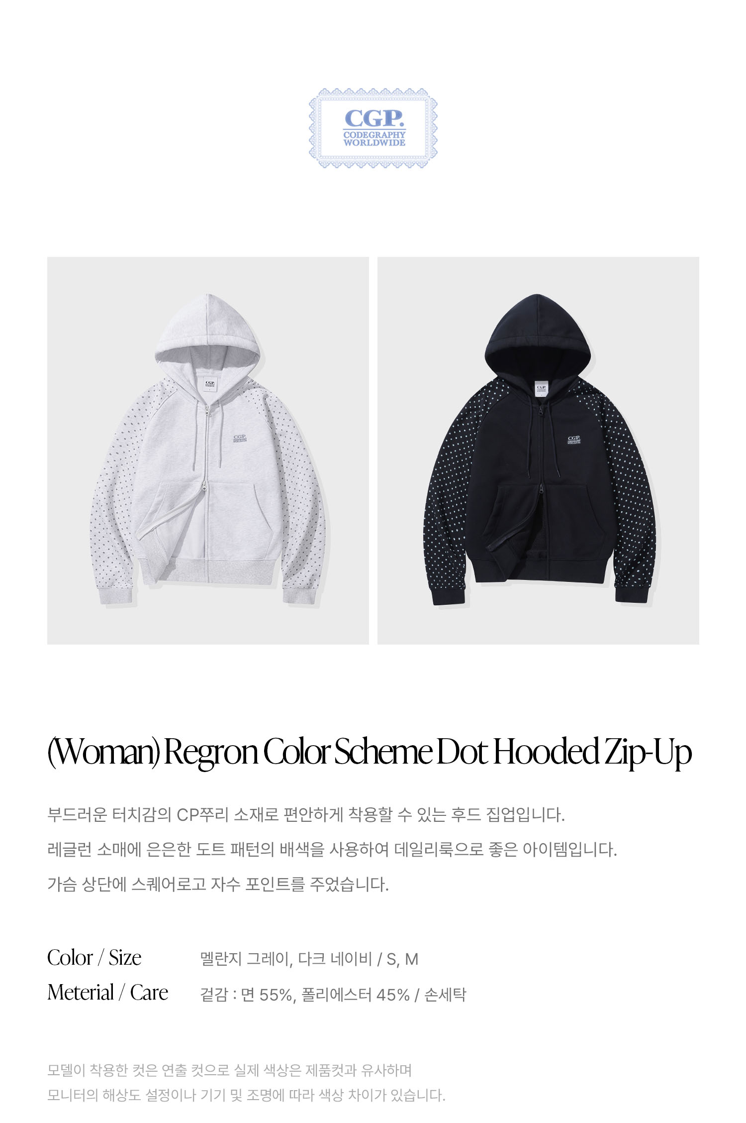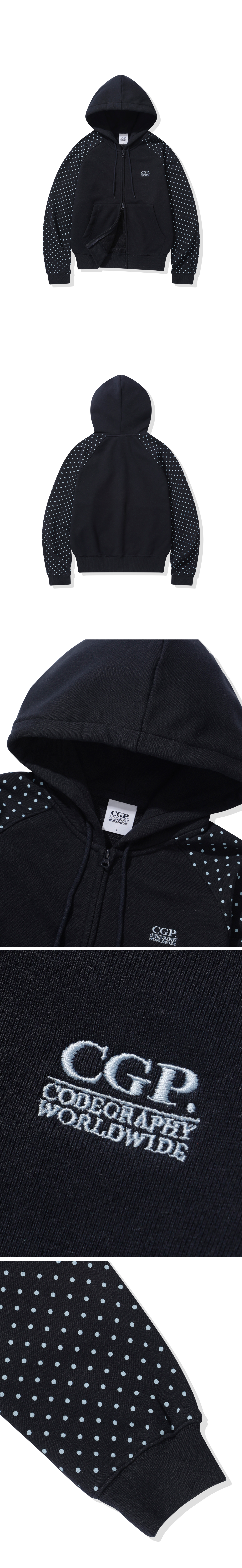 (우먼) 레글런 배색 도트 후드 집업-다크 네이비