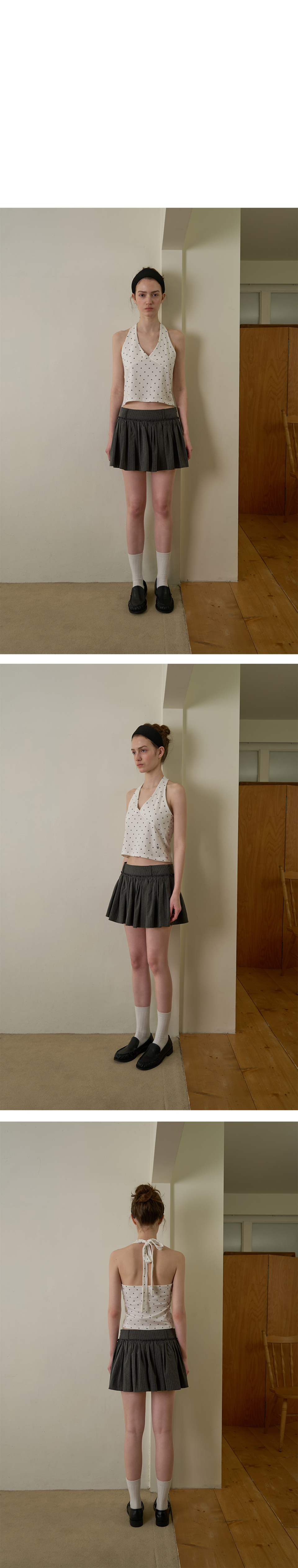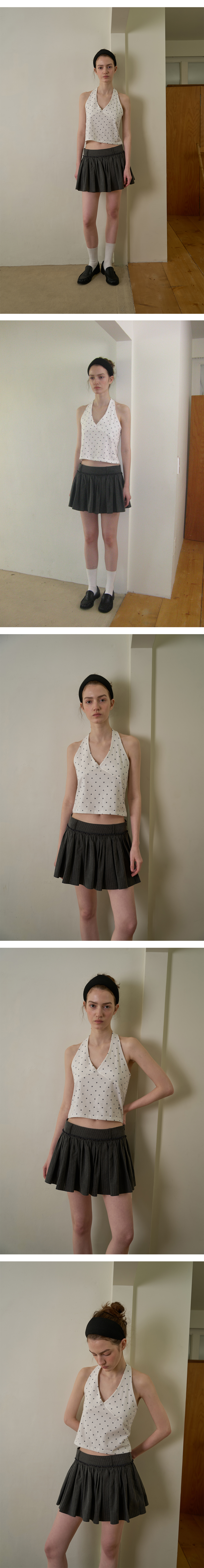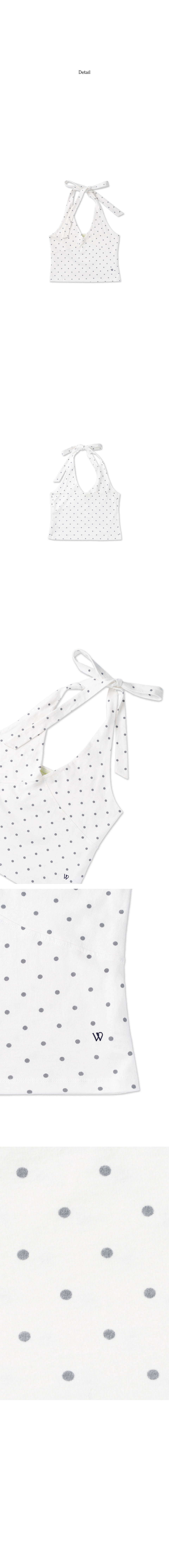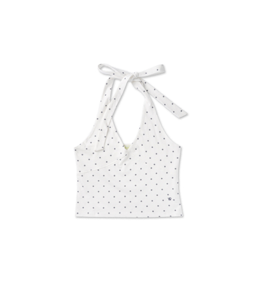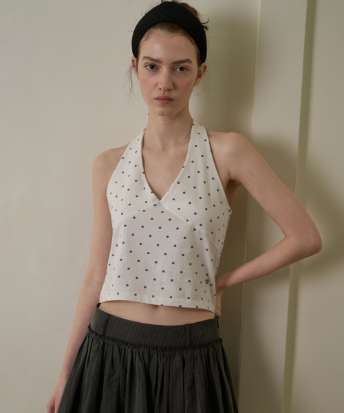 잔잔한 도트 패턴과 홀터넥 디자인이 어우러져 자연스럽게 페미닌한 무드를 연출하는 아이템입니다.