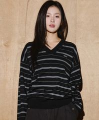 울 블렌드 캐롤 스트라이프 브이넥 니트 [블랙-블루]