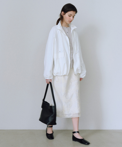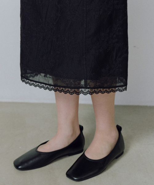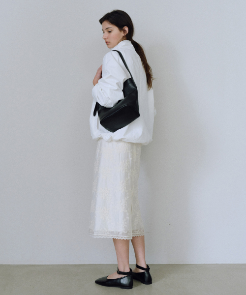 - 허릿단 뒷면에 지퍼를 사용해 군더더기 없는 핏을 연출하며 은은하게 비치는 시어한 텍스처 위에 섬세한 레이스 자수가 더해져 여성스럽고 로맨틱한 무드를 연출합니다.