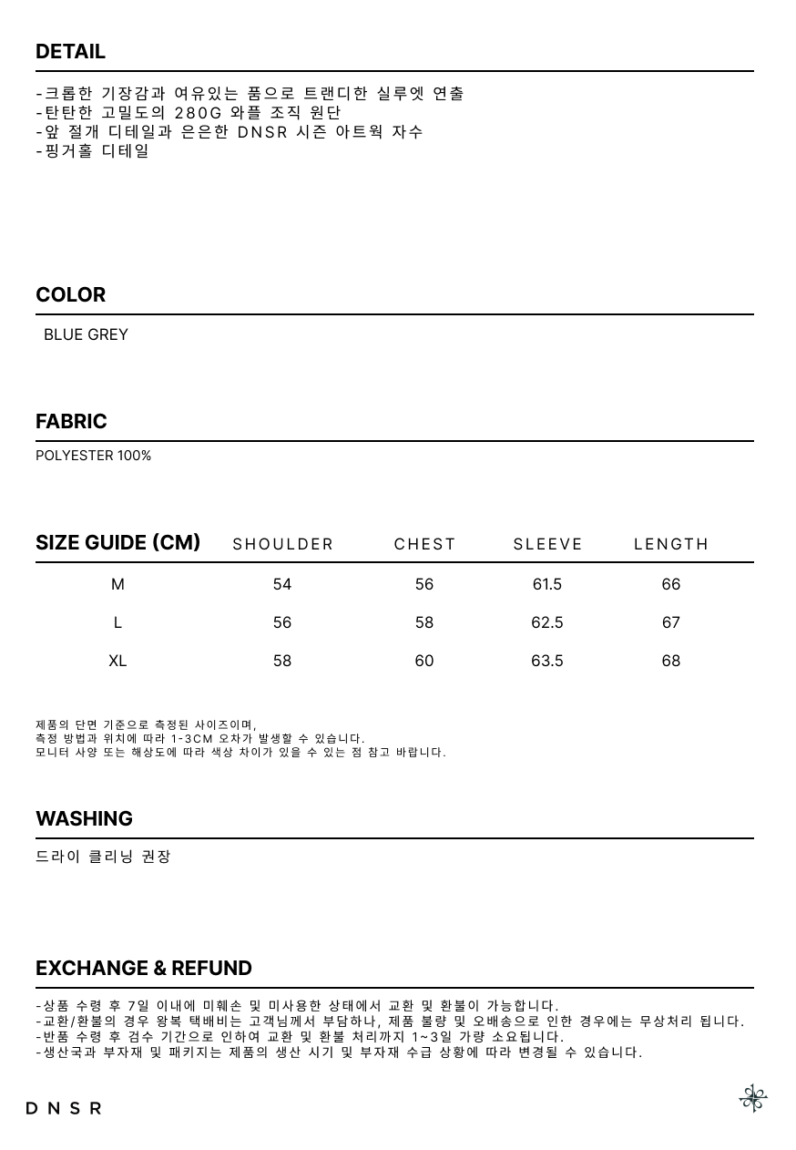 디앤에스알(DNSR)는 'Do New things, Something to realize'라는 슬로건을 바탕으로, 동시대에 흐름에 발 맞춰 항상 독창적이고 새로운 시도를 하고 있습니다. 디앤에스알의 DNA는 현대 복식을 기반으로 하는 오리지널리티의 견고한 테일러링을 고수하며 시대의 흐름을 읽고 변화하는 무드와 스타일링을 제안하는 스트릿 캐주얼 웨어입니다.