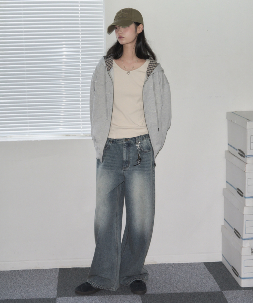 [레더리X아네딘] 스타 패치 체크 후드 집업 [MELANGE]
