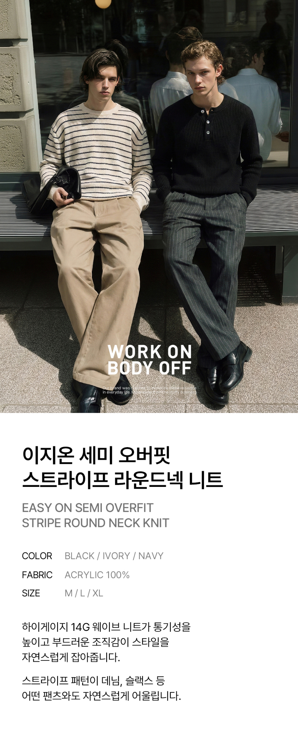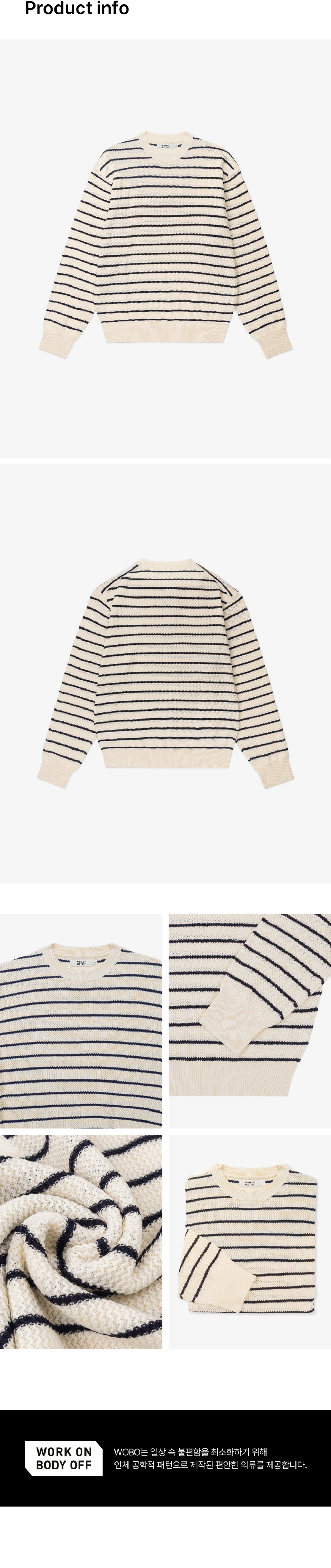 워크온바디오프(WORK ON BODY OFF)는 일상 속 불편함을 최소화 시키고자 탄생한 '오피스 워크 웨어' 브랜드입니다.