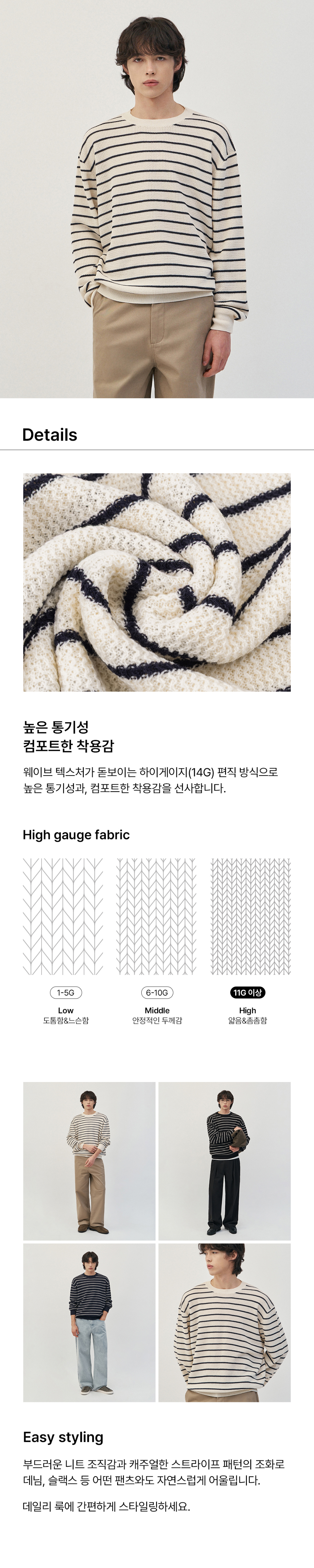 이지온 세미 오버핏 스트라이프 라운드넥 니트 [블랙]
