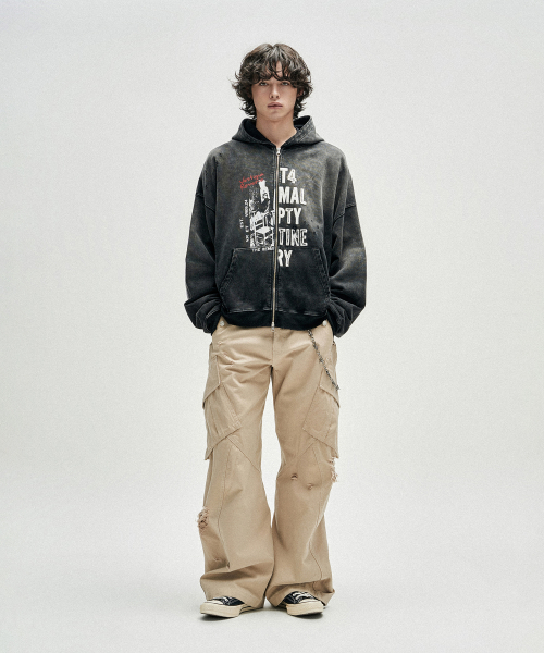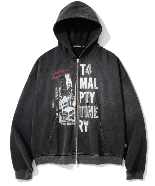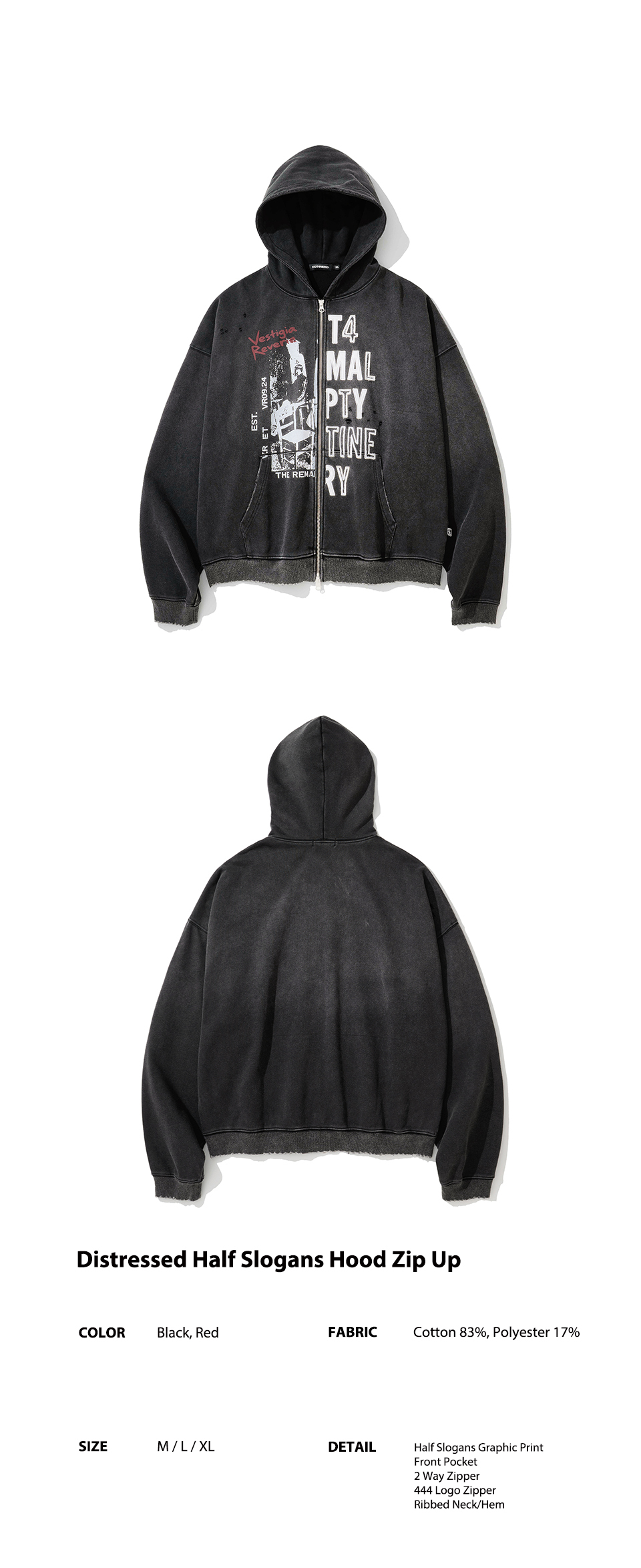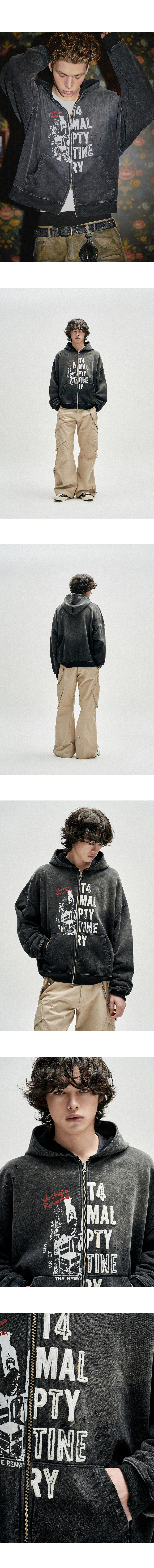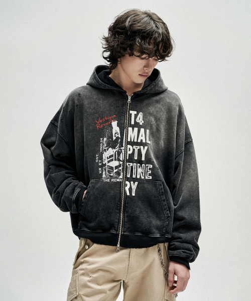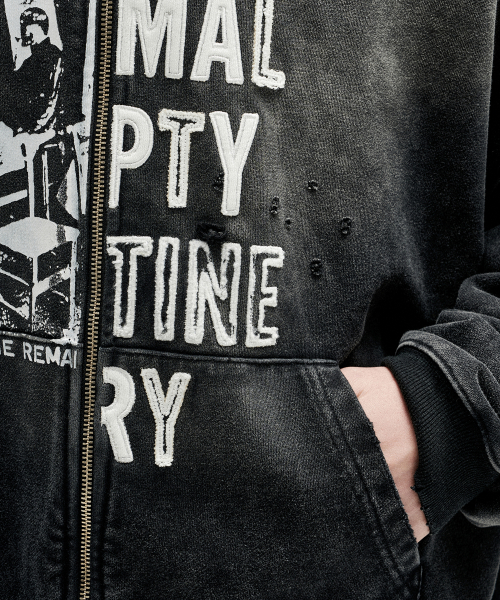 Distressed Half Slogans Hood Zip Up - Black