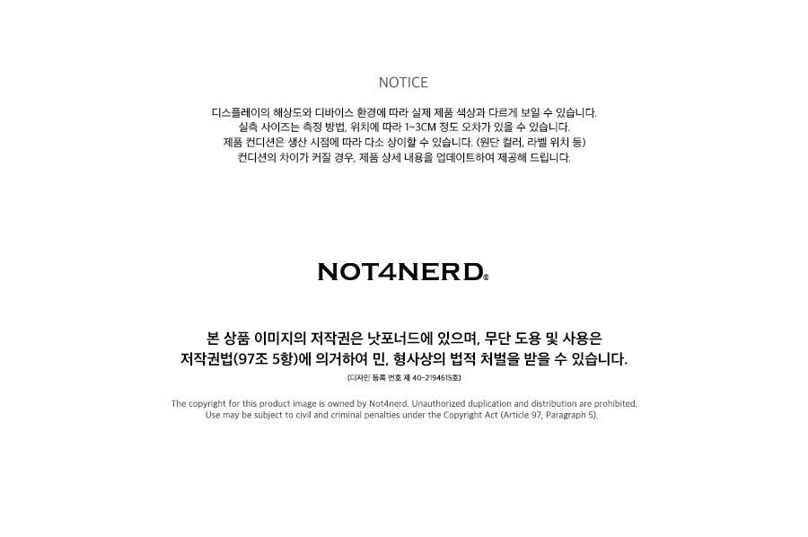 낫포너드(NOT4NERD)는 인간의 다양한 감정과 자유로움을 반항적인 디자인으로 선보이는 브랜드입니다. 4가지 요소 Normal(평범한)/Empty(의미 없는)/Routine(틀에 박힌)/Dry(지루한)에 반항하며, 정해진 틀을 깨고 새로운 흐름이 생기는 순간을 옷을 통해 전달하고자 합니다.