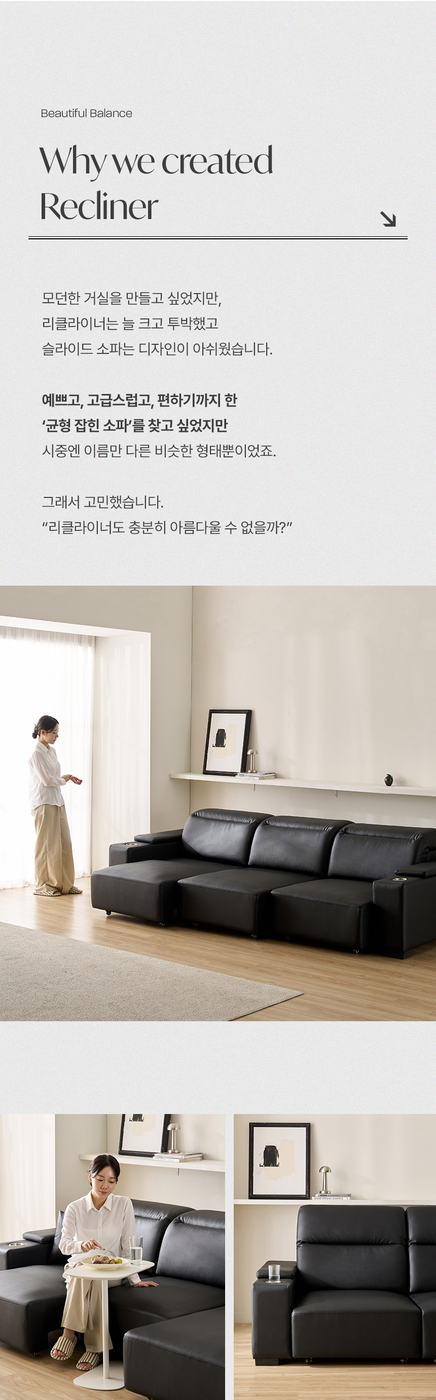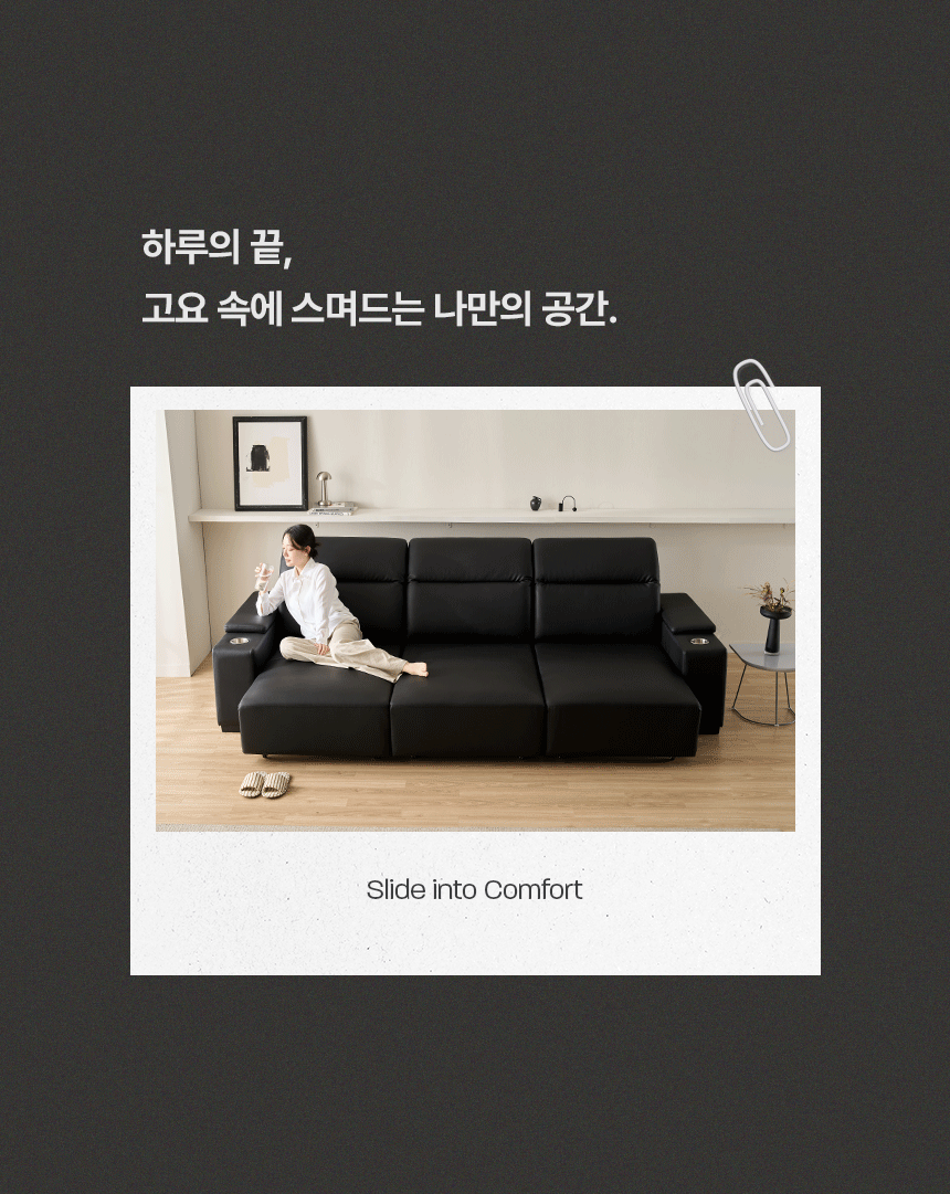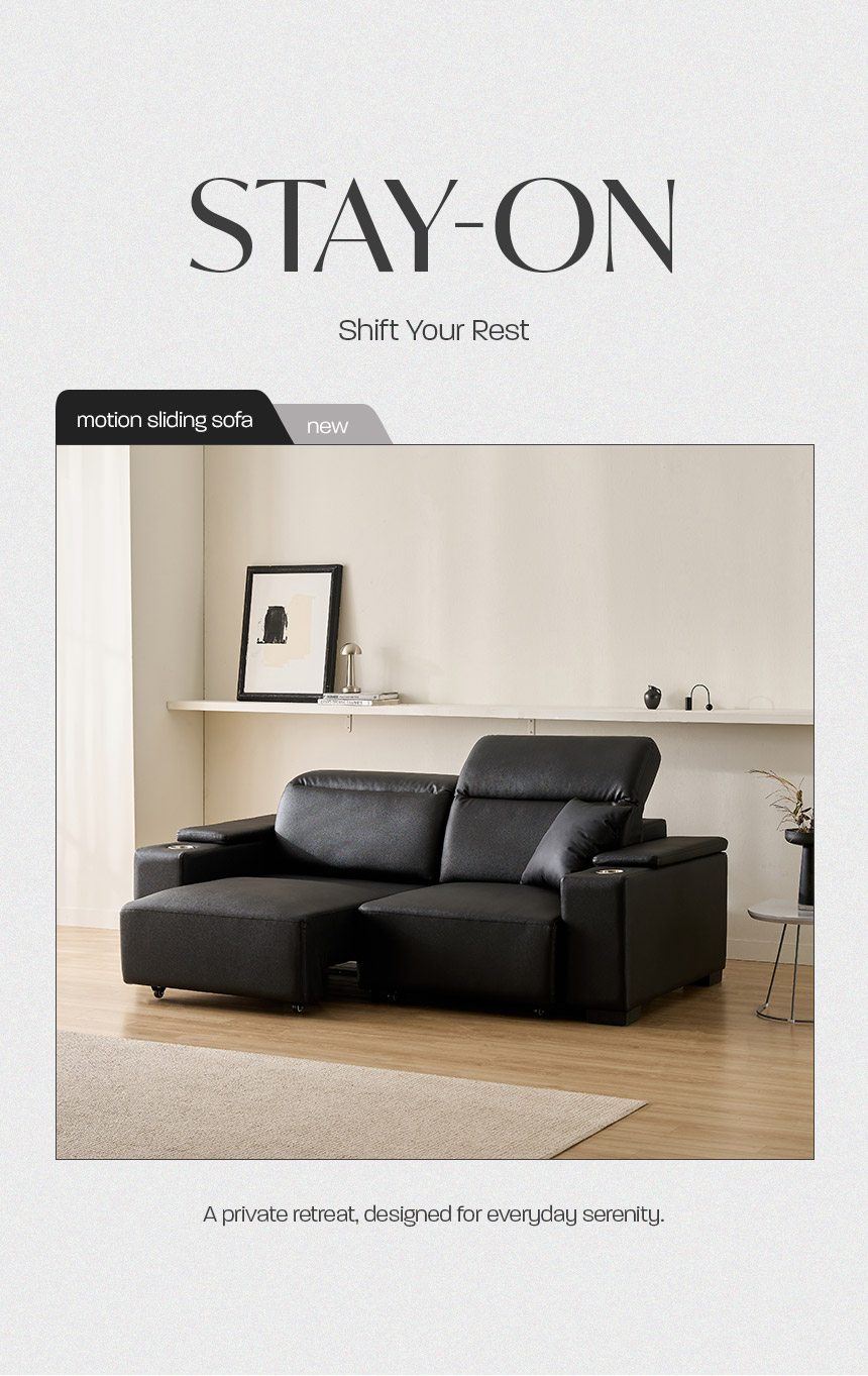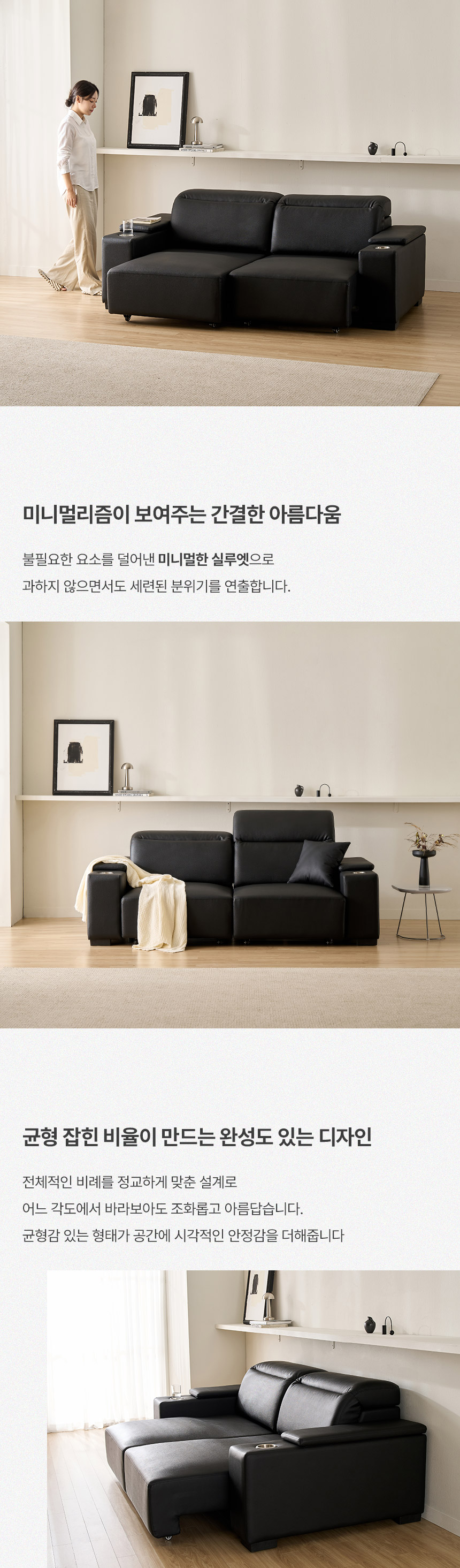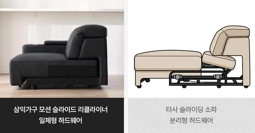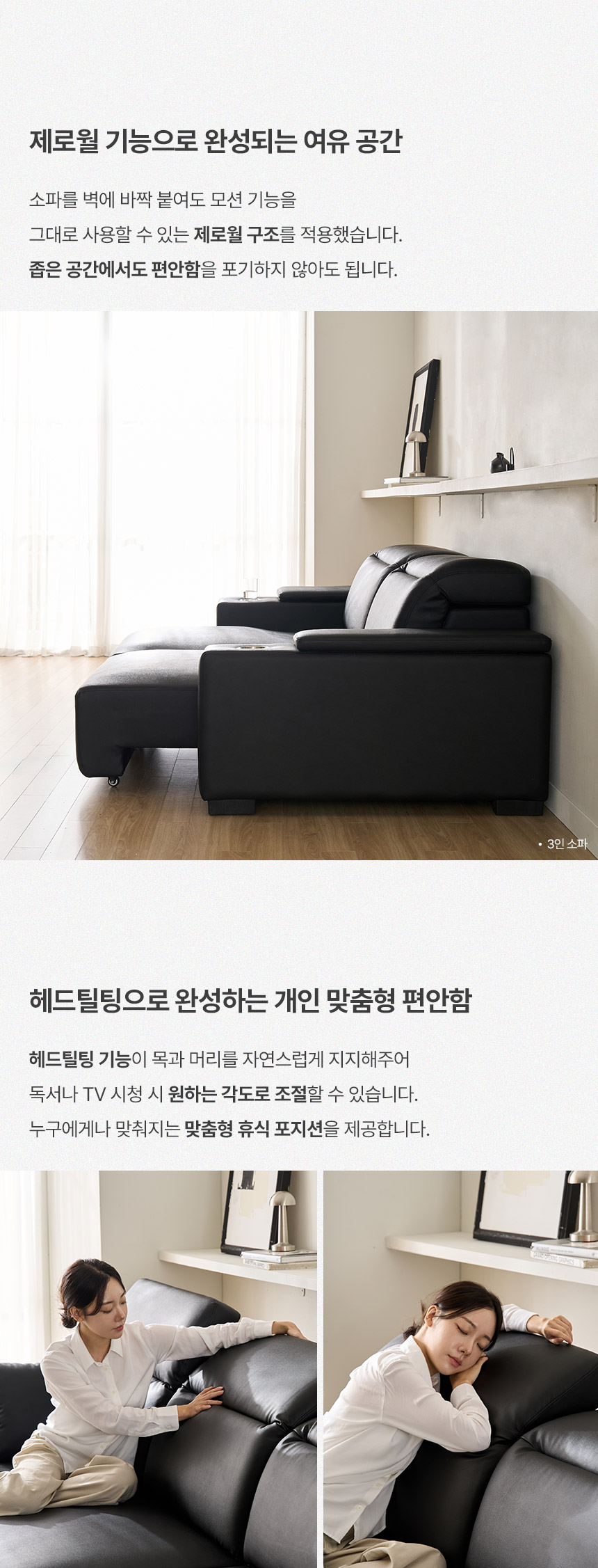 스테이온 헤드틸팅 모션 확장형 슬라이딩 3인용 가죽 리클라이너 소파(홈바형)