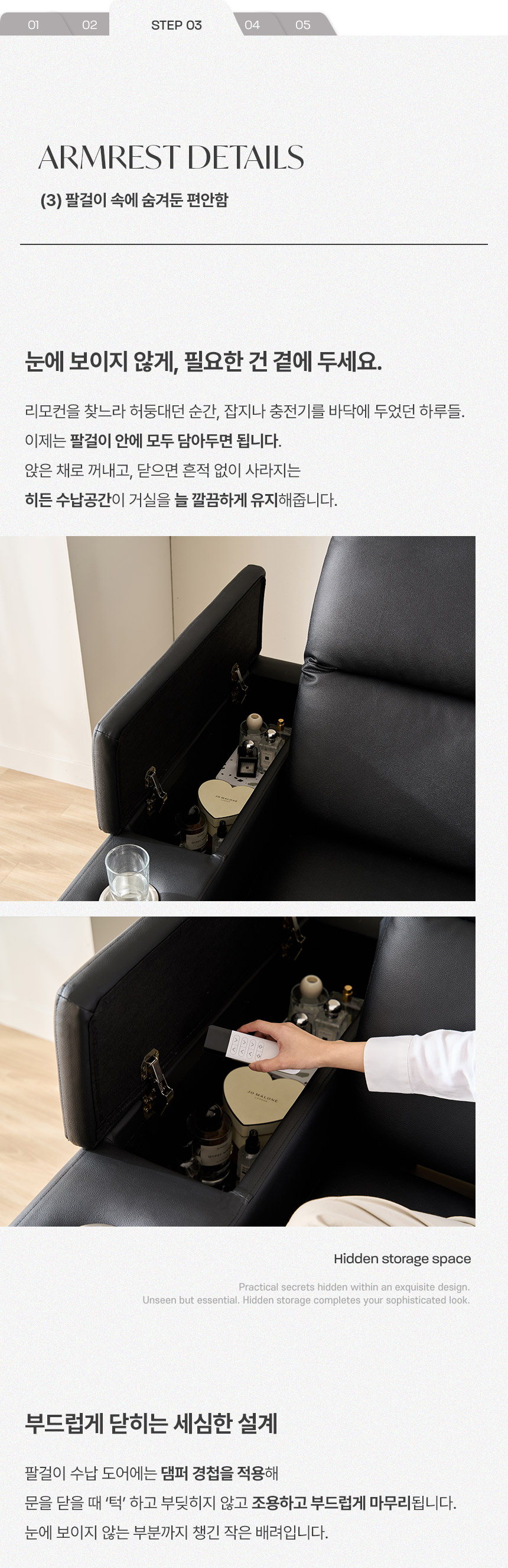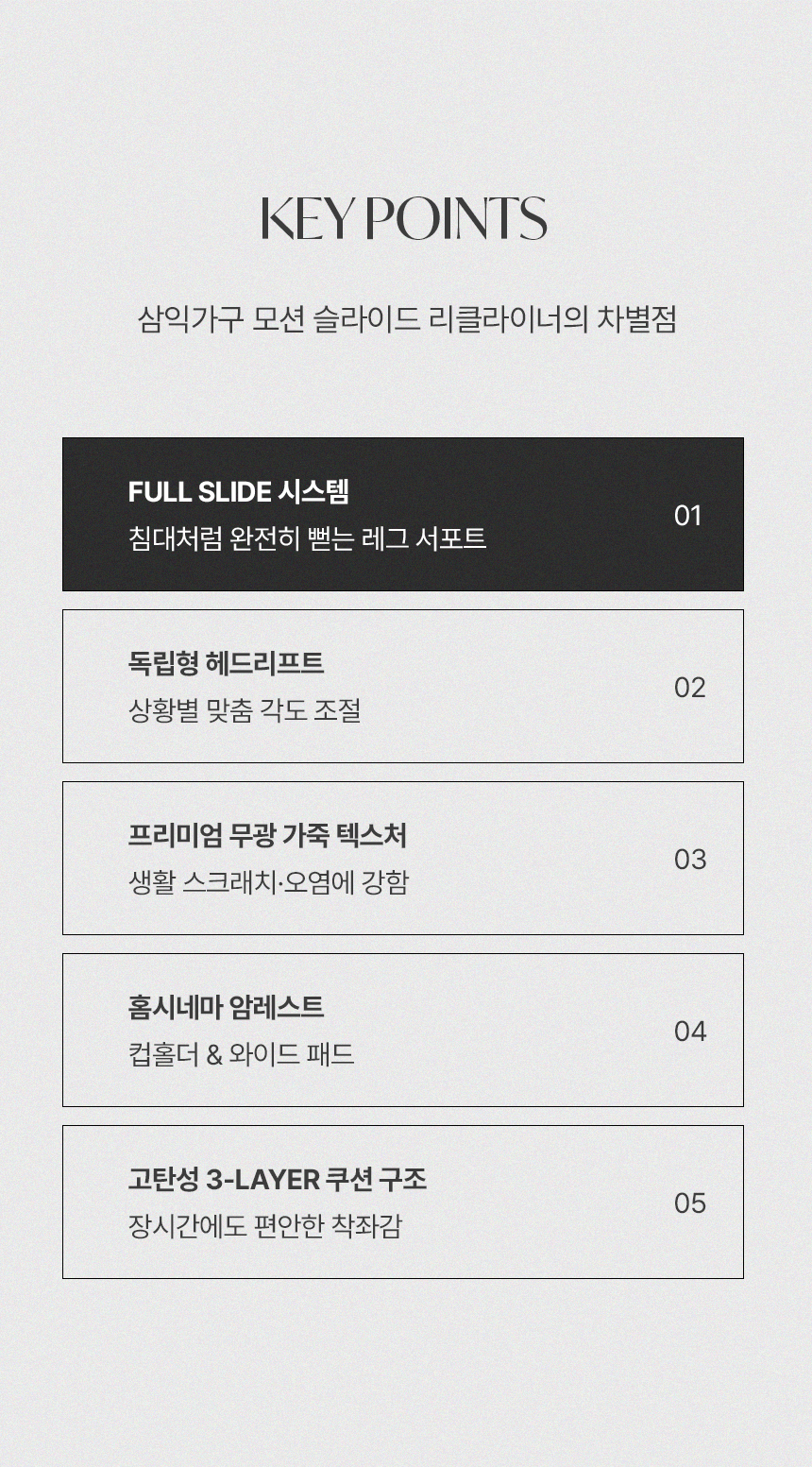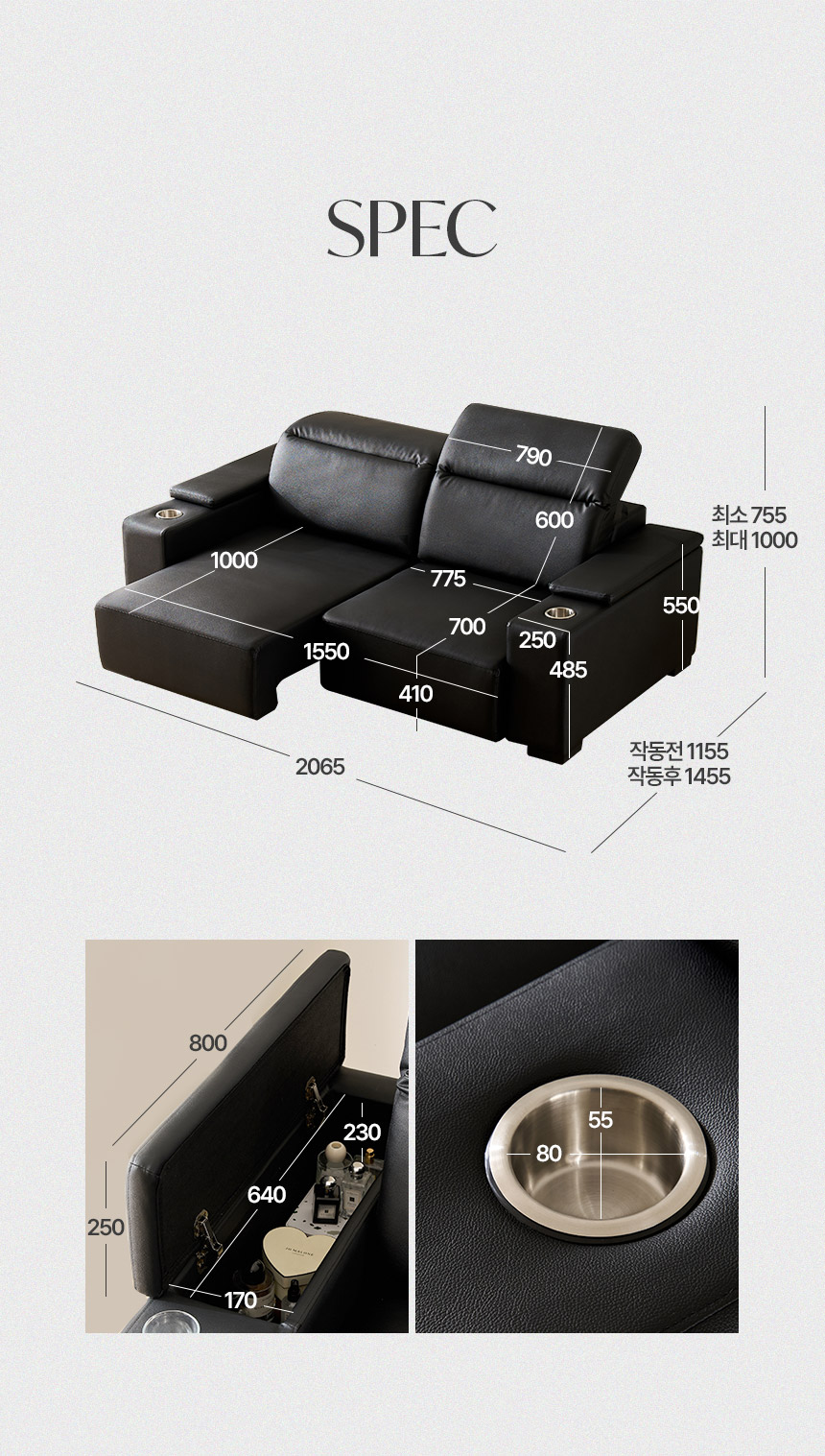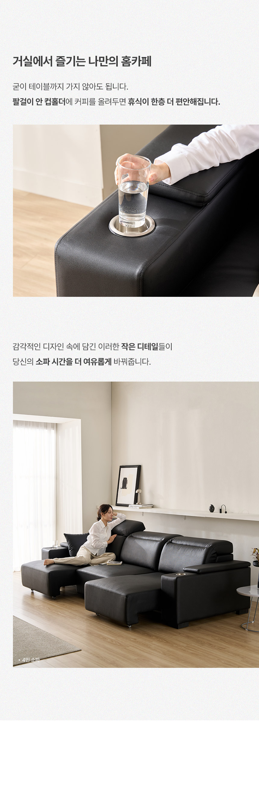 스테이온 헤드틸팅 모션 확장형 슬라이딩 3인용 가죽 리클라이너 소파(홈바형)