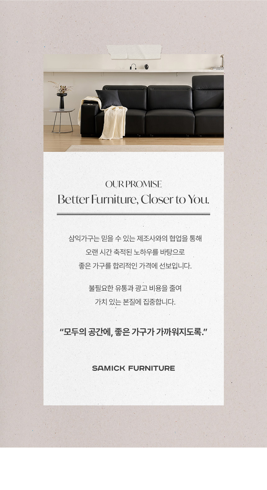 삼익가구(SAMICK)는 라이프스타일에 따른 공간의 가치 향상을 목표로 우수한 품질과 합리적인 가격, 차별화된 배송 시스템으로 고객 가치를 극대화하는 가구 유통 기업입니다.