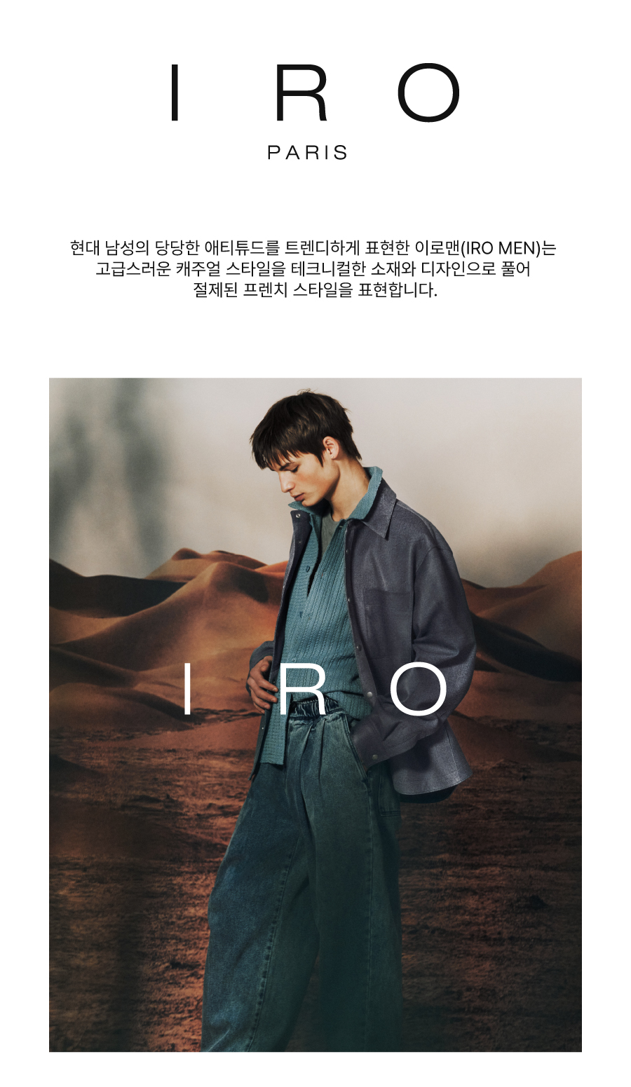 이로(IRO)는 인생의 주인공으로 살아가는 현대 남성의 단단한 애티튜드를 지향하며 고급스러움과 캐주얼 무드를 트렌디한 스타일과 감성으로 풀어냅니다. 계속해서 쌓아온 기술력과 아카이브, 테크니컬 소재의 조화를 통해 일상을 빛나게 해줍니다.