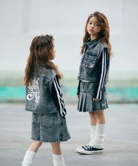 KIDS GIRL CROP DENIM VEST SETUP - DARK GREY