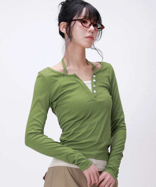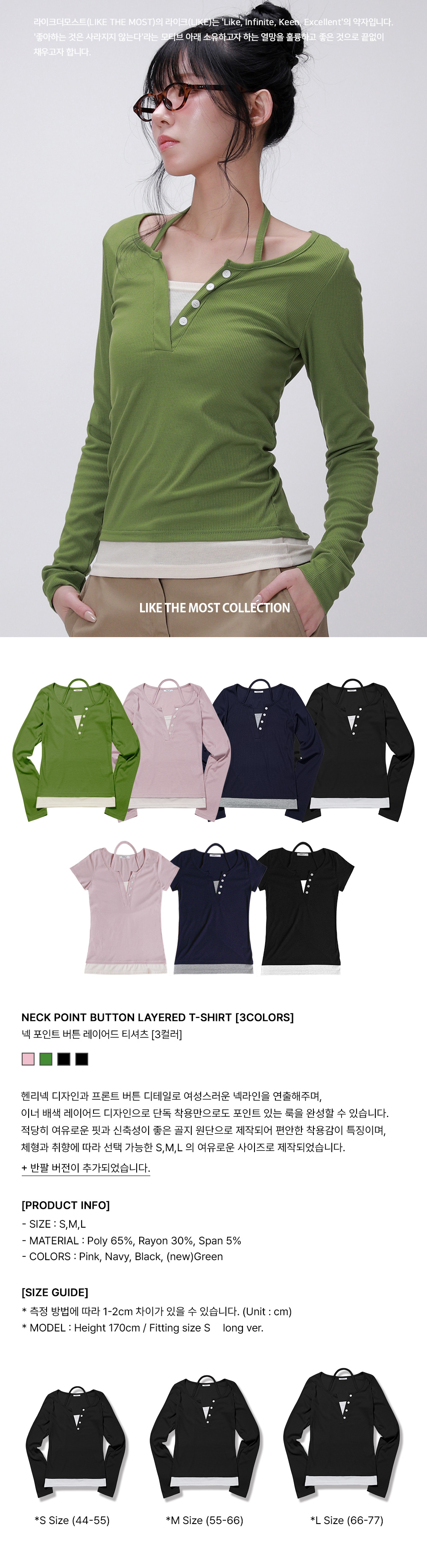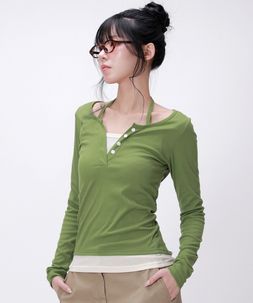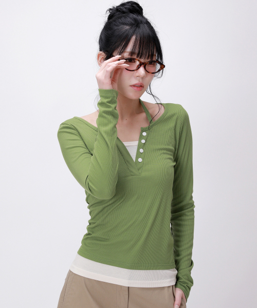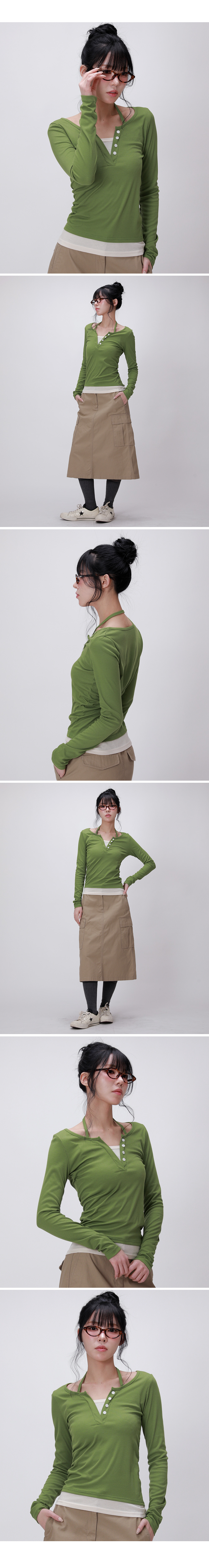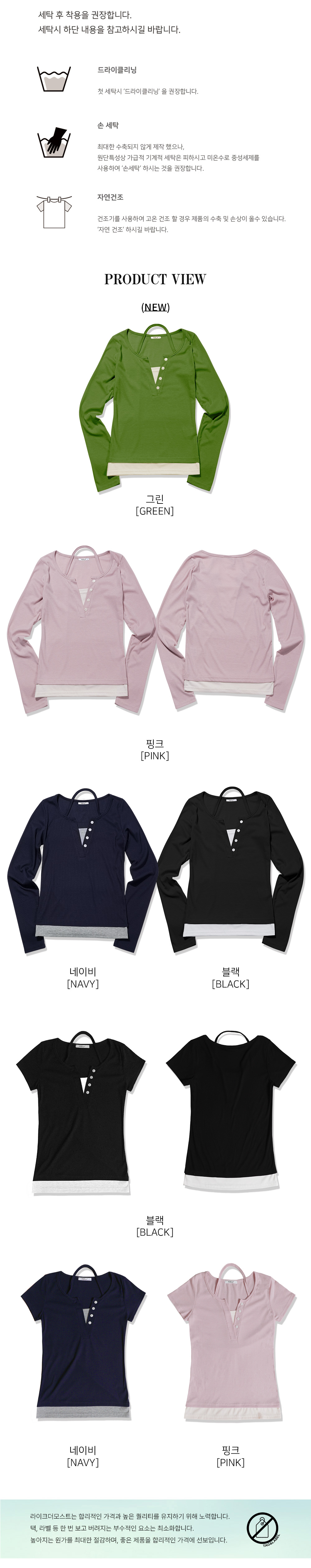 반팔 추가 넥포인트 버튼 레이어드 티셔츠_그린