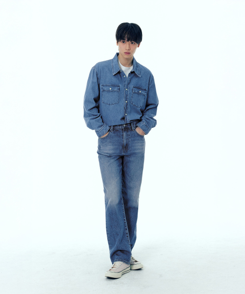 밀리터리 포켓 데님 셔츠 미드블루