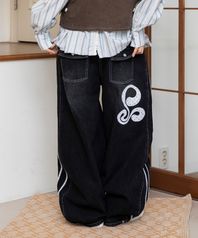 WXP070 도또우타 아플리케 레이스 데님팬츠 (BLACK)