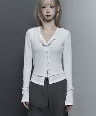 네크라인에는 핀코트 디테일로 포인트를 주었으며, 천연 자개 단추를 사용하여 고급스럽게 마무리하였습니다.