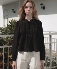 목선을 따라 올라오는 넥 라인과 잔잔한 주름 디테일이 여성스럽고 차분한 분위기를 더해주며,