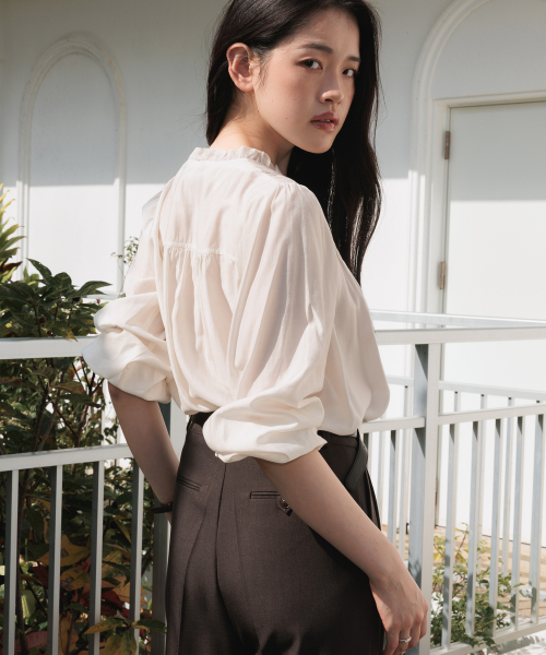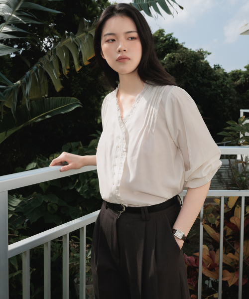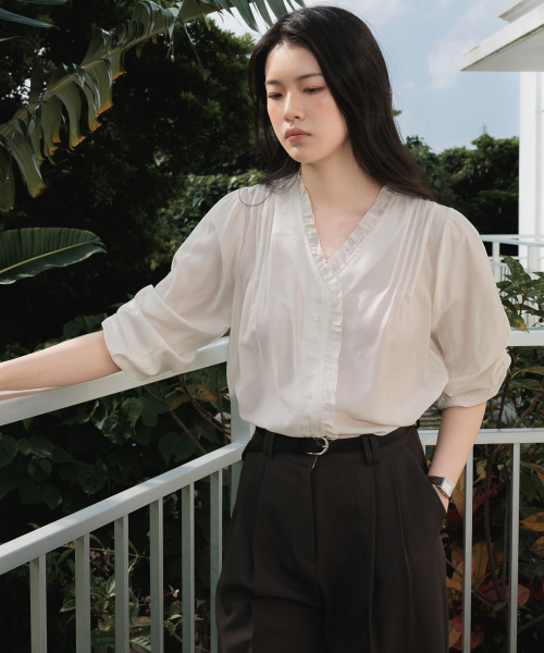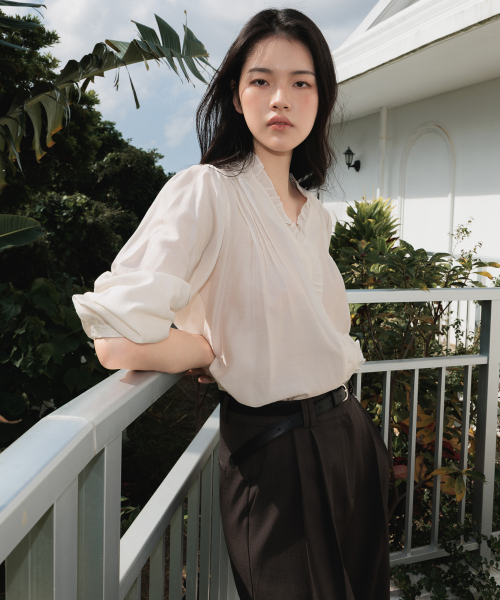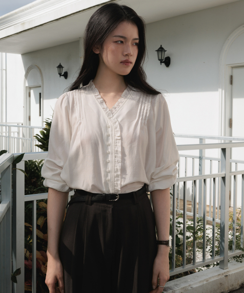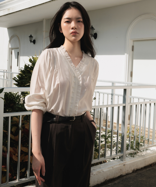 적당한 깊이감의 브이넥 라인에는 프릴 디테일을 더해 페미닌한 분위기를 살렸고, 어깨에는 정교한 핀턱 포인트를 더해 입체적인 실루엣을 완성했습니다.