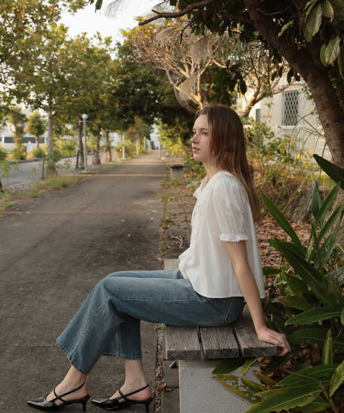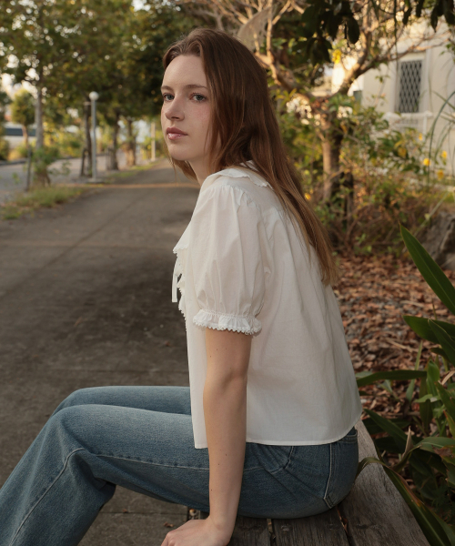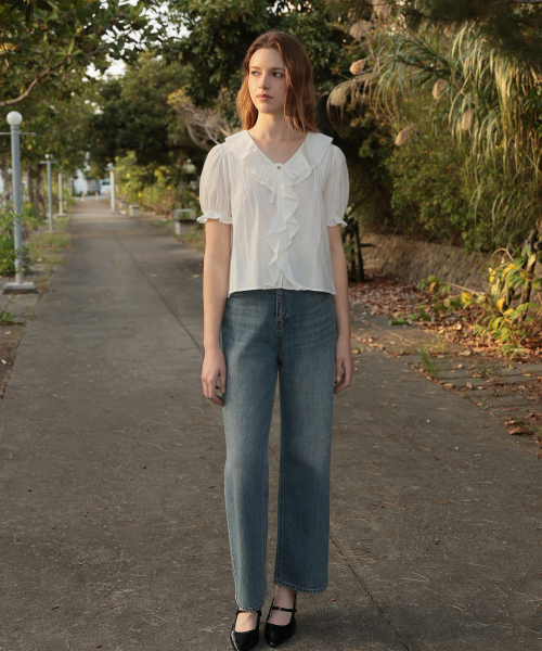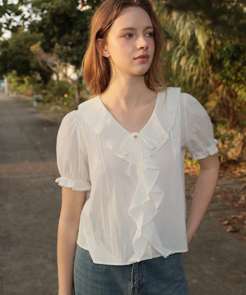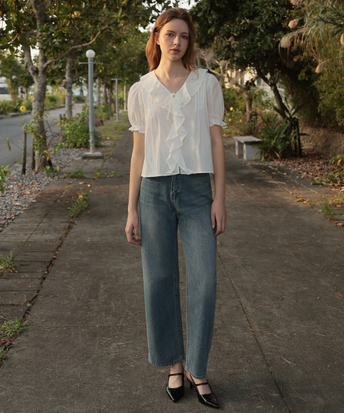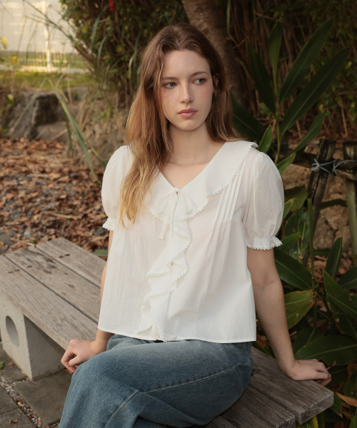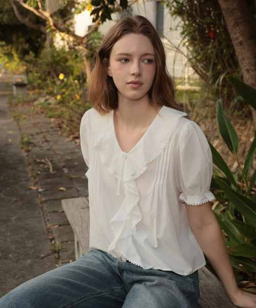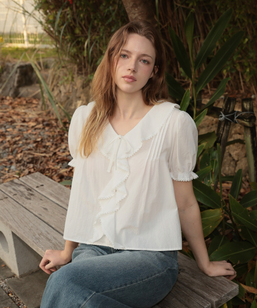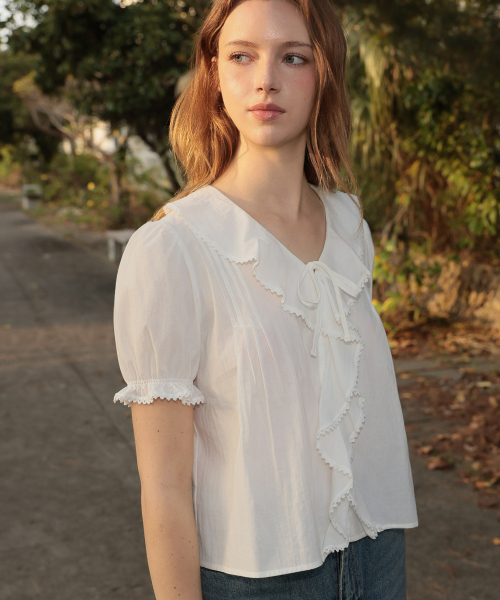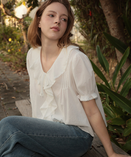 러블리한 러플 디테일과 어깨에 정교한 핀턱 디테일 포인트로 페미닌한 무드를 주며