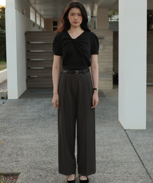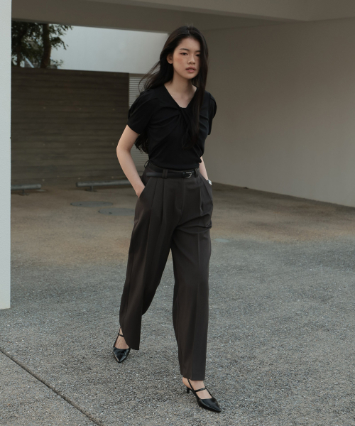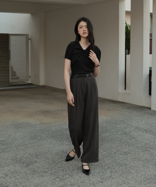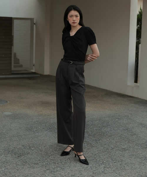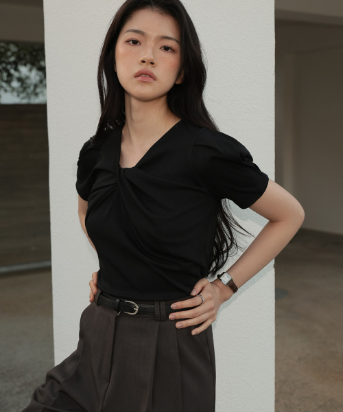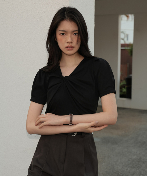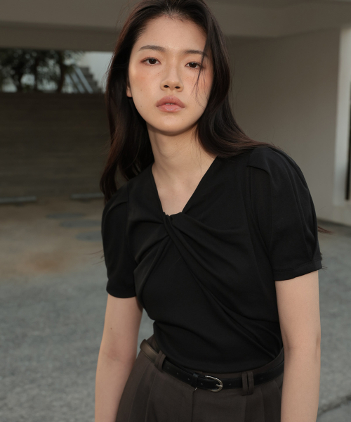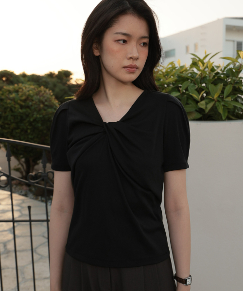 네크라인에 트위스트 디테일이 돋보이는 반팔 티셔츠 입니다.