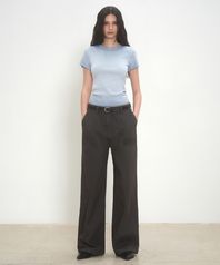 허리를 안정적으로 잡아주는 하이웨스트 디자인과 여유 있게 떨어지는 와이드 핏으로 다리가 길어 보이는 효과를 주는 디자인입니다.