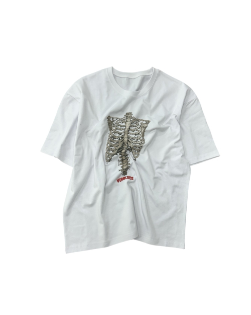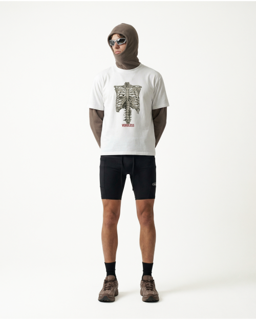인체 구조에서 영감을 받은 리브 케이지 그래픽으로 강렬한 무드를 담은 크롭 티셔츠.