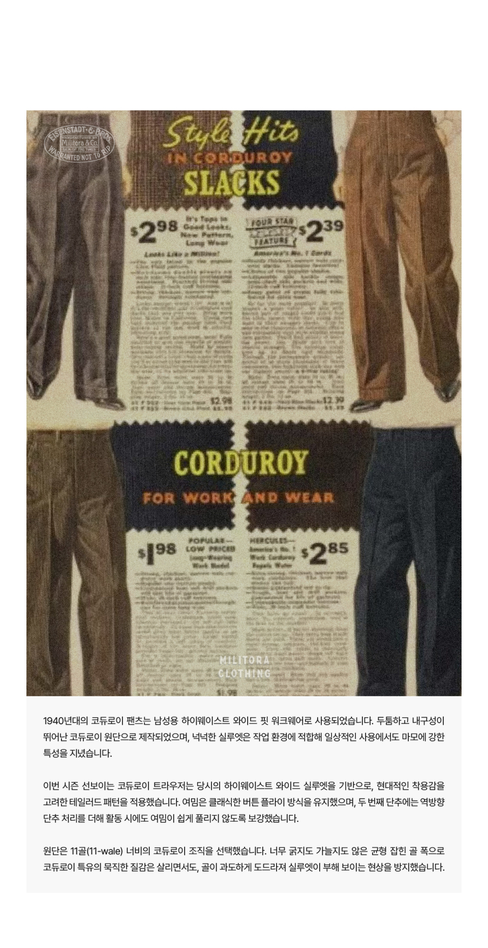 밀리토라(MILITORA)는 절제된 디테일로 강인한 매력을 표현하는 브랜드입니다. 1930년대 데님과 워크 트라우저 등 워크 웨어 기반의 의류를 현대적으로 복각합니다.