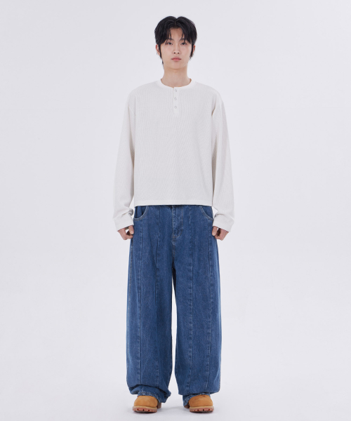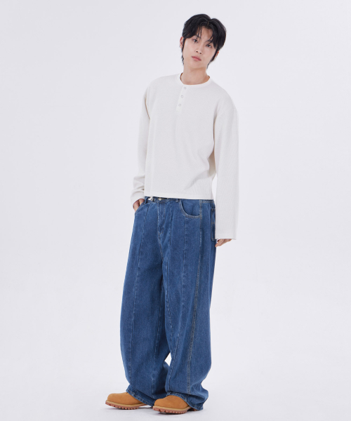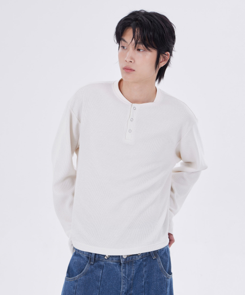 스트라이프 와플 링 스냅 헨리넥 롱 슬리브_4color