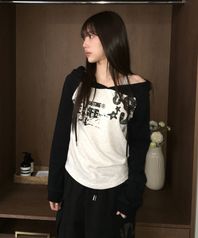 오프숄더 레터링 그래픽 후드 긴팔 티셔츠 GREY