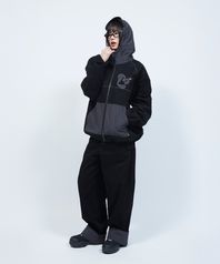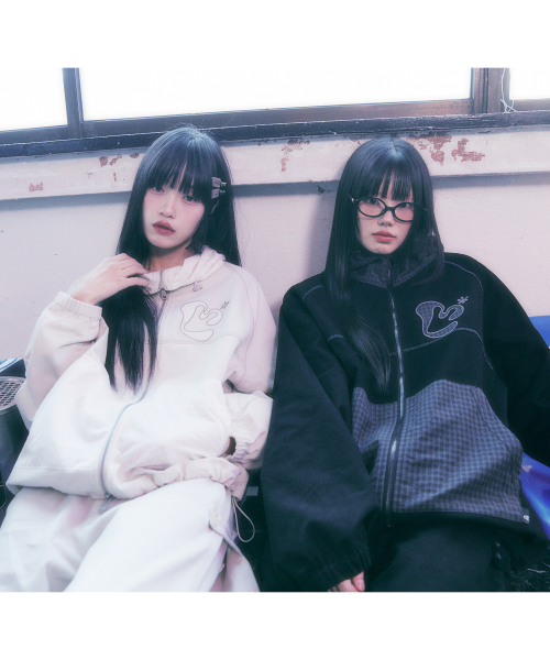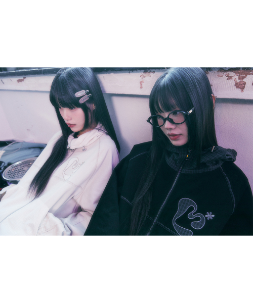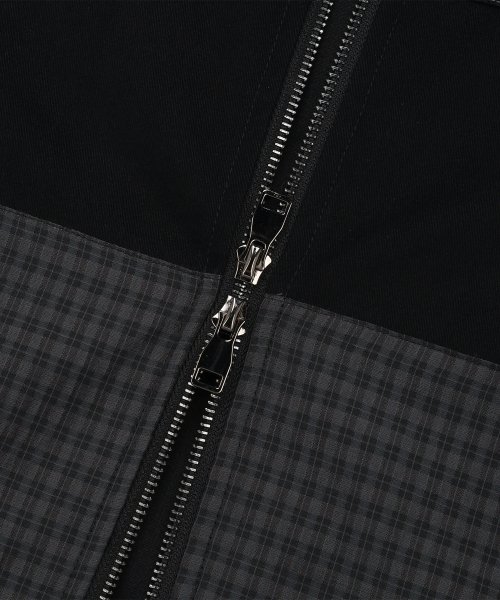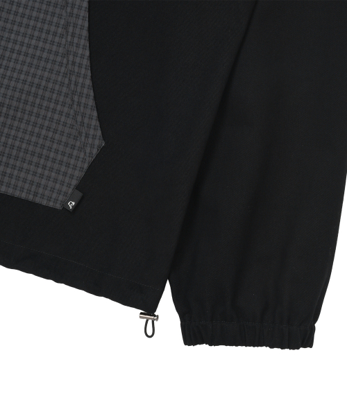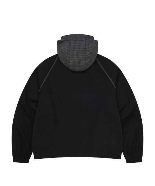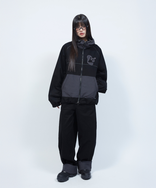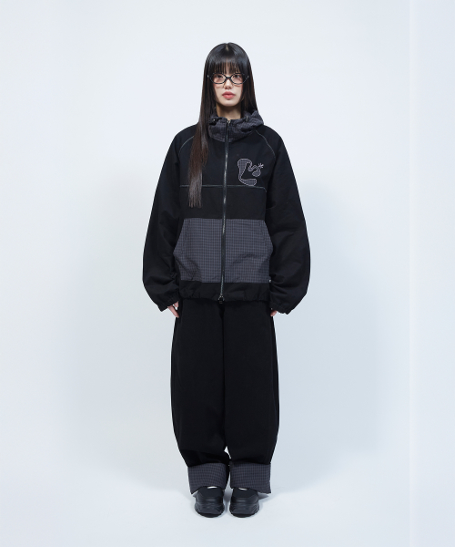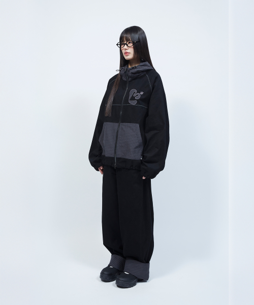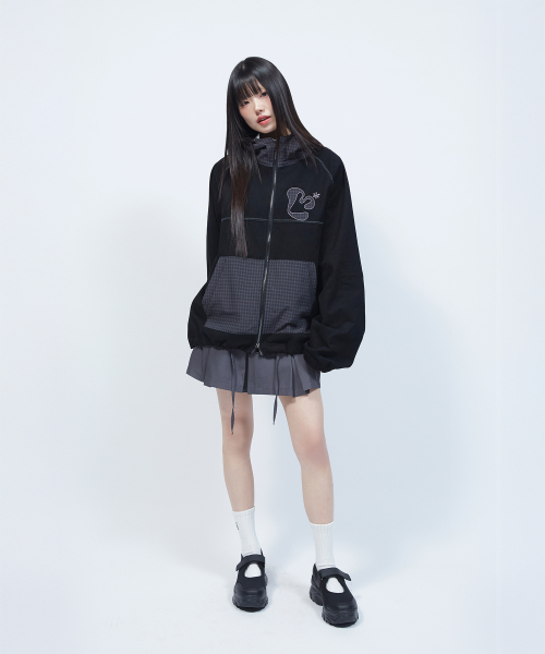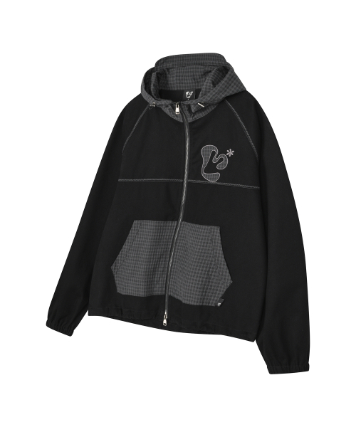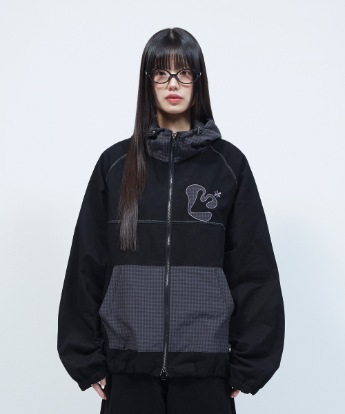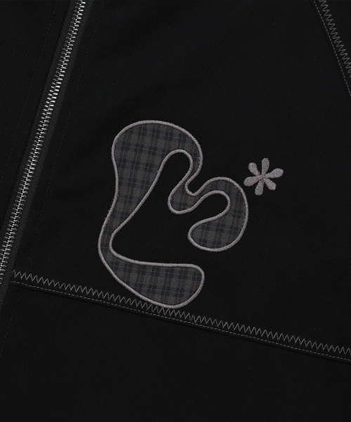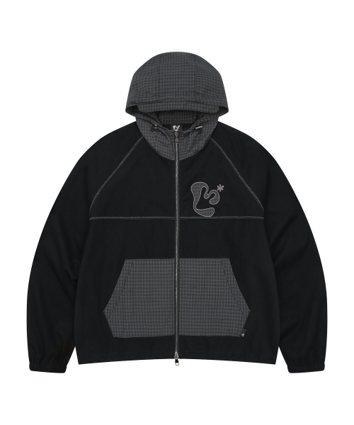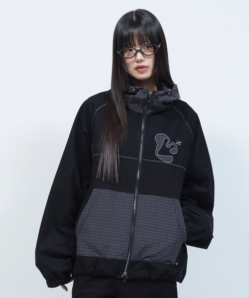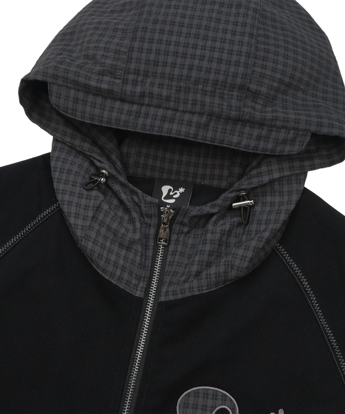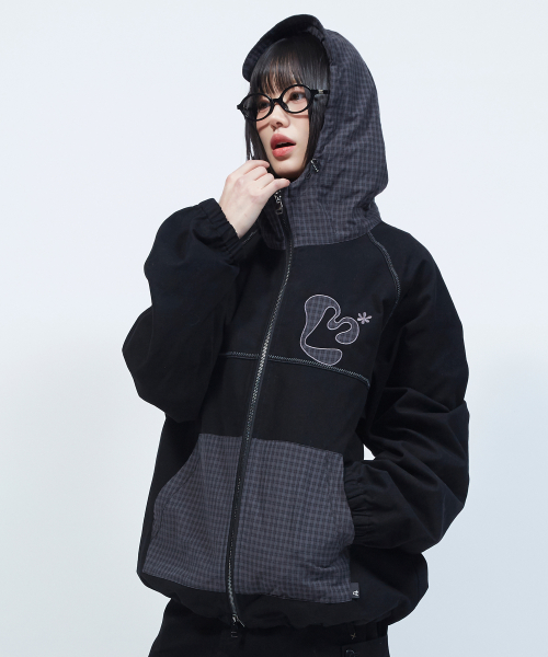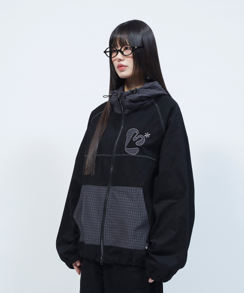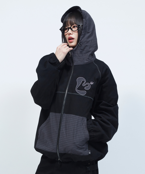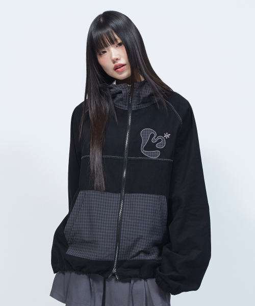 아플리케 플로럴 로고 체크 배색 후드 자켓 BLACK