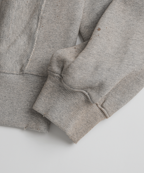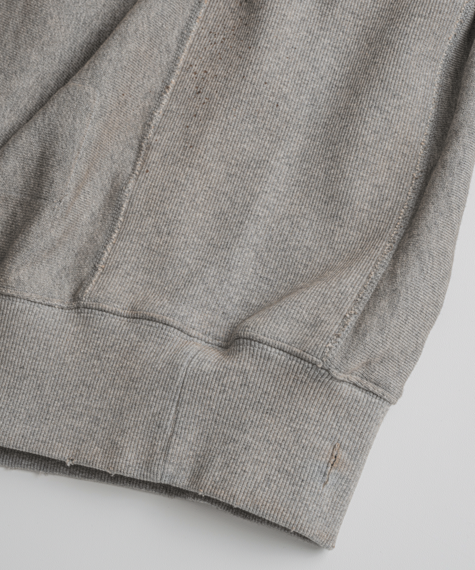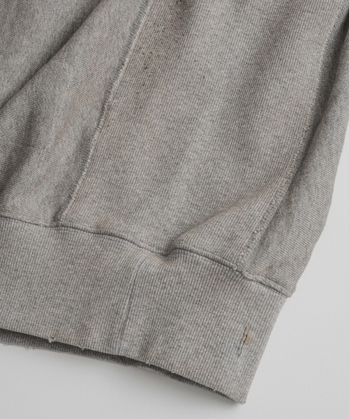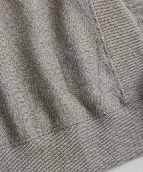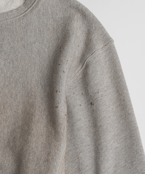 보다 가벼워진 360gsm 중량의 프렌치 테리 패브릭을 사용해 공기감을 머금은 가벼운 착용감과 함께 자연스럽게 흐르는 드레이프가 형성됩니다. 표면에만 염색을 더하는 브러쉬 염색 공정과 오일 페인팅을 병행해, 세월이 축적된 듯한 깊이 있는 컬러를 표현했습니다. 여기에 구간별 페인팅 및 디스트레스드 가공을 보다 섬세하게 적용해, 과하지 않으면서도 빈티지한 무드를 강조했습니다.